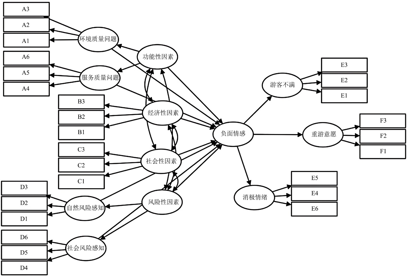 功能性因素分为环境质量和服务质量两个维度。环境质量包括由景观环境、文化内涵以及食住行游购娱等功能营造出的整体环境氛围;服务质量指游客对旅游消费过程中的旅游服务设施、公共服务设施和服务人员及其服务水平的感知。二者共同满足旅游者的功能需求并反映目的地旅游供给能力和质量。提出假设H1:功能性因素显著正向影响负面情感。