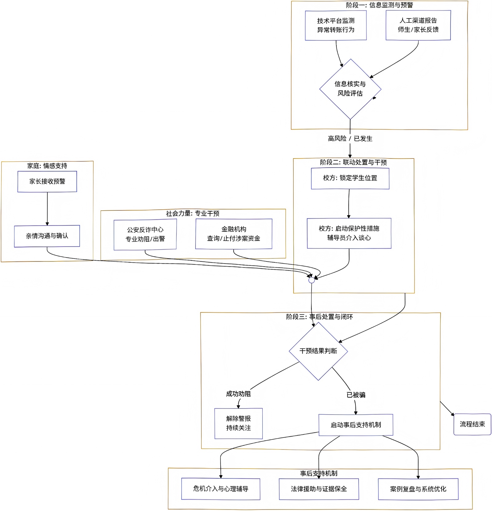 构建家庭、学校、社会与政府多方联动的协同机制,联动机制流程见图1。家庭应转变重学业、轻安全的教育理念,强化日常沟通,开展风险提示,重视财商教育,引导子女树立正确的消费观念和理财意识。在社会与政府层面,需加强网络空间监管,完善个人信息保护相关法规,对诈骗犯罪保持高压打击力度;电信、金融等行业应落实主体责任,严格执行电话卡、银行卡实名制,拦截可疑交易;主流媒体、社交平台应通过案例剖析、反诈短片等形式,广泛传播防骗知识与法律常识。借助技术赋能,推广国家反诈中心APP等官方工具,运用大数据与人工智能技术分析诈骗链路与行为模式,实现对潜在受害用户的精准识别与实时预警。