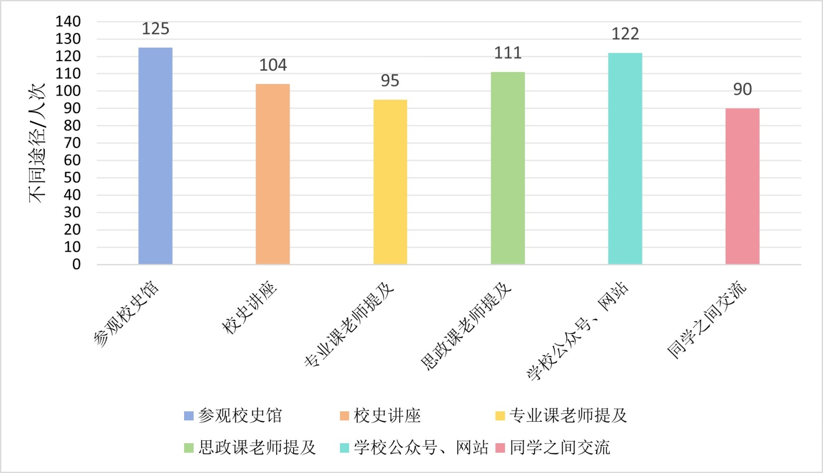 目前,杭州医学院校史中的红医精神相关资源散见于校史馆陈列、档案文献、校友口述史等不同载体,尚未形成系统整合的资源库。学生了解校史资源的途径主要有参观校史馆、参加校史讲座、专业课教师提及、思政课教师提及、浏览学校公众号和网站,以及同学之间互相交流等方式,调研数据反映学生了解校史资源的途径分布广,但没有明显集中的途径。相对来说,选择参观校史馆和浏览学校公众号和网站的人群稍多,但没有集中的选择,存在学习资源碎片化的现象,这种碎片化导致学生对红医精神的理解缺乏连贯性和系统性,难以形成全面而深刻的认识见图1。