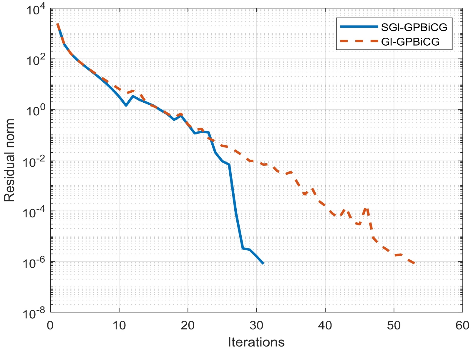 数值结果见表3和图1。从表3可以看出SGl-GPBiCG方法比Gl-GPBiCG的迭代次数更少。此外,从图1也可以看出,SGl-GPBiCG方法的收敛速度优于Gl-GPBiCG方法。