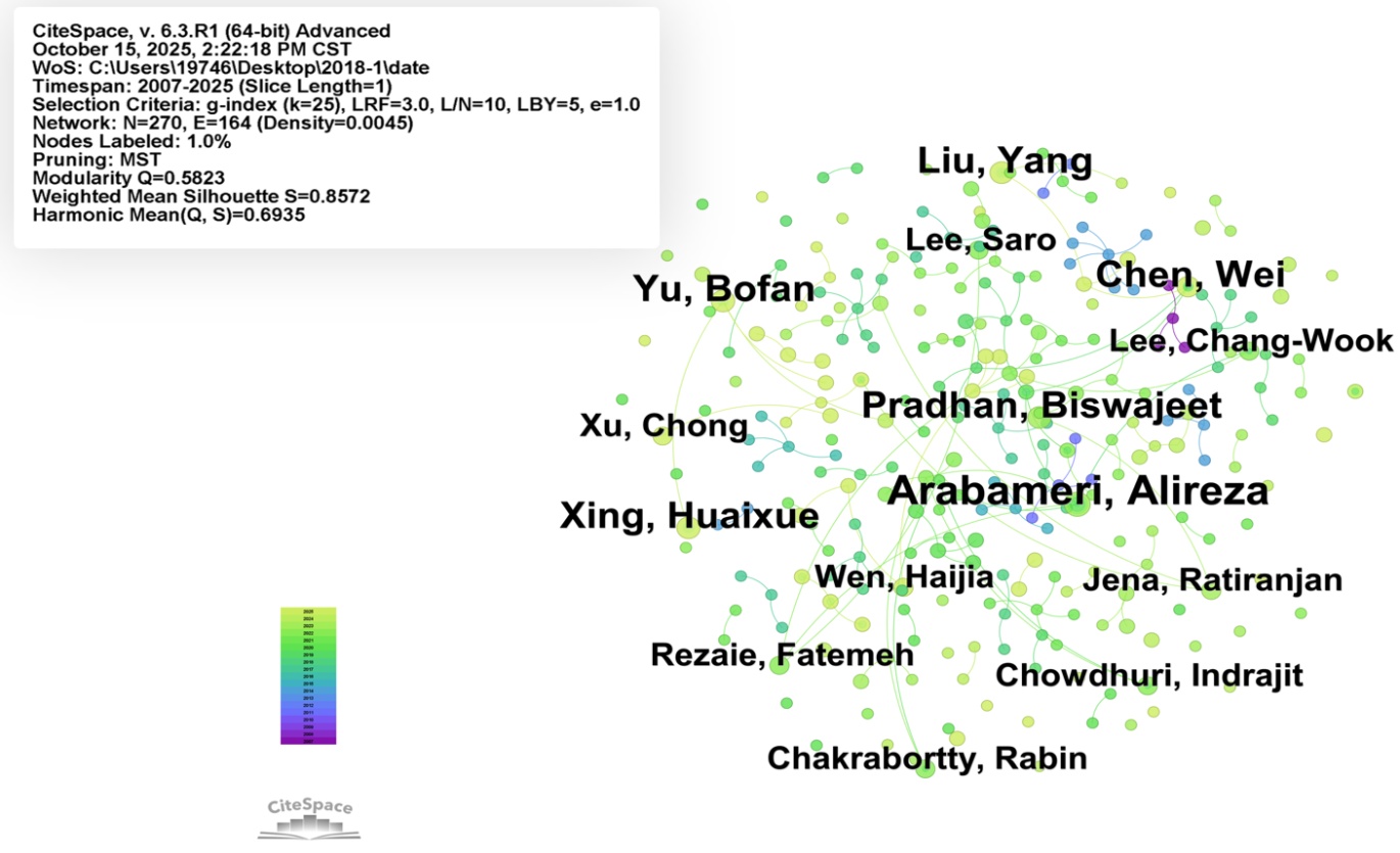 图3为WOS数据库的作者合作网络(270节点、164连线)。国外学者中,Arabameri Alirez [13]与Pradhan Biswajeet [14]是核心节点,合作网络范围广,中心性高,研究主题集中在机器学习模型(RF, SVM, ANN)在滑坡易发性预测中的应用。其中,Arabameri Alirez [13]等利用逻辑回归模型,结合GIS与遥感数据对马来西亚金马伦高原进行滑坡灾害危险性分析,结果表明模型准确率达85.73%,生成的灾害图可为区域风险评估与基础设施规划提供可靠依据;Pradhan Biswajeet [14]等通过集成频率比与随机森林模型,并对比PALSAR、ASTER与SRTM三种DEM数据,发现FR-RF集成模型与高分辨率PALSAR数据结合可实现最佳预测性能(AUC = 0.917),其成果为当地滑坡灾害防控提供了精准决策依据。与之形成紧密合作的还有Yu Bofan [15]、Xing Huaixue、Xu Chong [16]等。总体Q值0.5823表明聚类合理,说明国际研究呈现跨国、多机构协作的特征。