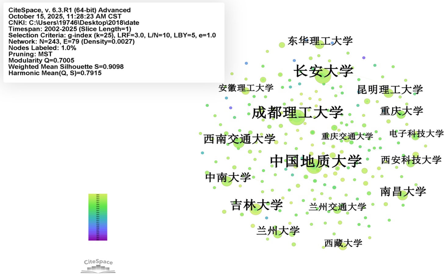 图4显示CNKI数据库中243个节点的机构合作结构。成都理工大学、中国地质大学、长安大学为主要发文单位,节点较大且颜色偏绿,表明在2018~2024年间保持了持续活跃。其余如西南交通大学、中南大学、吉林大学等也在该领域具有较高研究贡献。总体Q值0.7005说明聚类结构清晰,但网络密度0.0027偏低,显示国内高校间仍需加强纵横向协作。