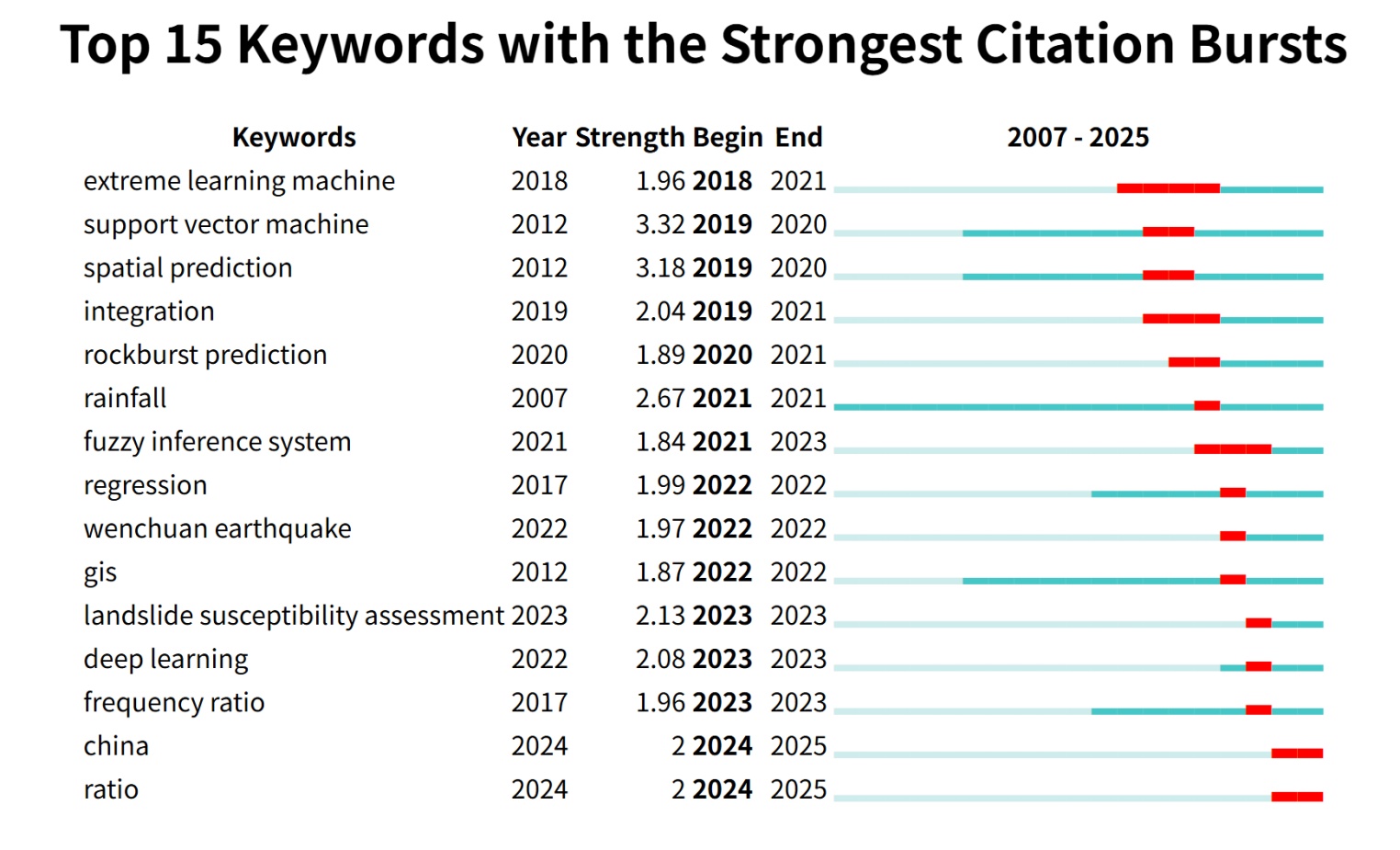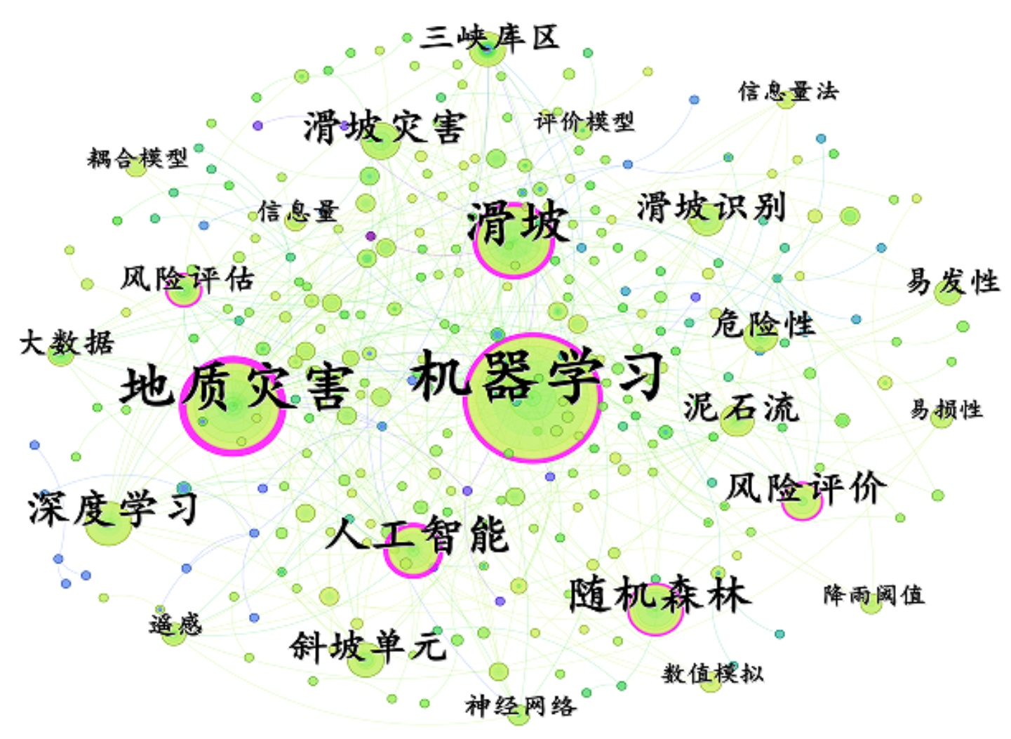 这些高频共现主题揭示出地质灾害研究正在从“地质机制分析”向“智能预测建模”演化,研究范式发生了从理论经验到数据驱动的重大转型。