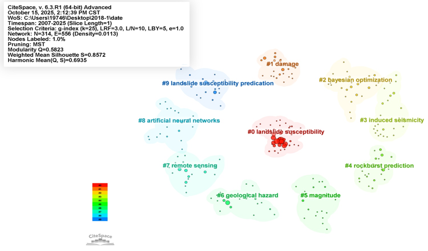 完成数据清洗与标准化处理后,使用CiteSpace绘制了作者合作网络、机构合作网络、关键词共现网络、聚类图谱、时间线图谱及突现图谱,旨在从多个维度可视化展示人工智能在地质灾害预测与防治中的应用格局。通过对发文量时序变化、核心作者与机构分布、关键词共现与聚类特征的系统分析,本研究揭示了该领域的研究热点、发展脉络与前沿趋势,为后续学者深入探索提供了可靠的文献计量依据与参考方向。
