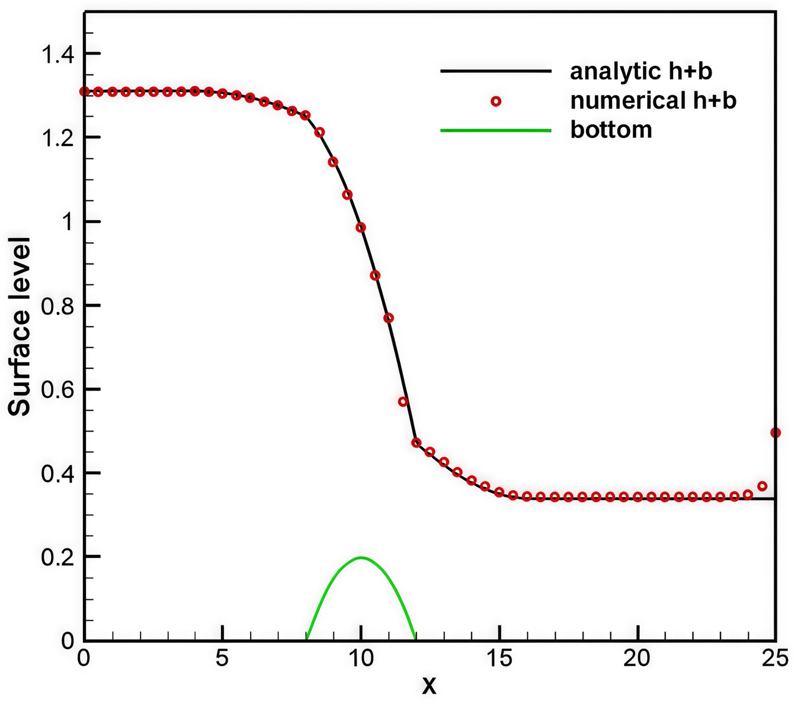 本数值算例中[13],我们研究了RKDG方法在不同孔隙度条件下的稳定性。在[15]中,使用相同的试验验证了浅水波方程的良好平衡RKDG方法的性能。计算区域设为[0, 25],底部地形定义为: