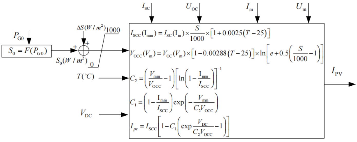 如图8,光伏方阵由太阳电池组件串、并联构成,其作用是直接把太阳能转换为直流形式的电能。若忽略单体太阳电池生产过程中的差异、组件相互之间的连接电阻,且假设单体太阳电池具有理想的一致性,则光伏方阵的伏安特性曲线可以看作是单体太阳电池伏安特性曲线按串、并联方式放大其坐标的比例尺,光伏方阵的伏安特性曲线具有和单体太阳电池同样的形状。光伏发电系统中使用的逆变器是一种将太阳能电池所产生的直流电能转换成交流电能的转换装置。控制光伏方阵的负载工作在光伏方阵最大功率点位置,最大程度利用 光伏方阵输出功率;同时,它使转换后的交流电的电压、频率与电力系统向负载提供的交流电的电压、频率一致。光伏方阵工程应用模型模拟不同辐照度和温度下光伏方阵的光电转换特性。输入量包括:太阳幅照度S,工作温度T,光伏阵列直流工作电压Udc;输出量为光伏阵列输出电流Iarray。在给定太阳幅照度S和工作温度T下。