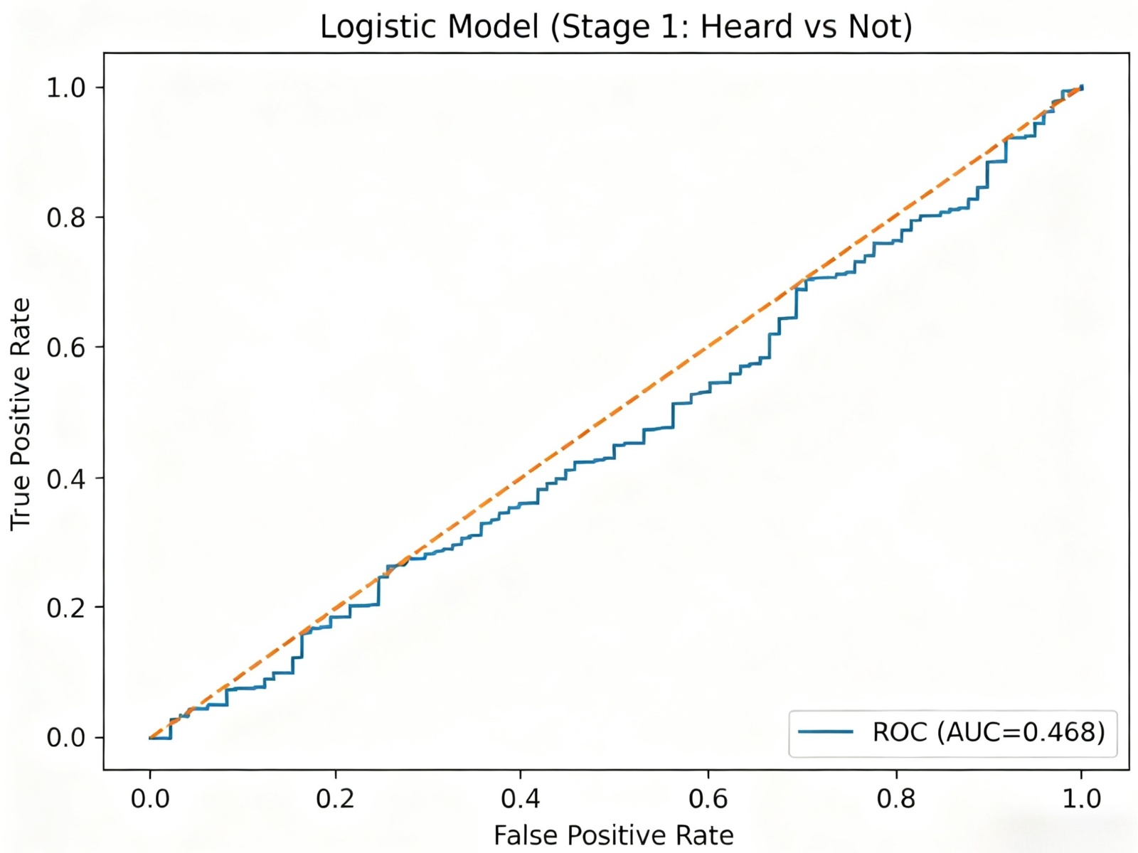 Logit回归结果显示,在基础认知层面如图6,仅居住地变量对是否听说过存在显著影响,某类居住地居民的优势比约为2.01 (P < 0.05),意味着其认知概率大约是基准组的两倍。其余人口学特征,包括性别、年龄、收入和学历均未通过显著性检验。这说明“是否知道”已经在不同群体中广泛普及,人口学差异不足以形成显著区分。进一步看模型表现,样本内AUC为0.63,交叉验证AUC约为0.47,表明模型区分能力有限,验证了基础认知的高度普及性。