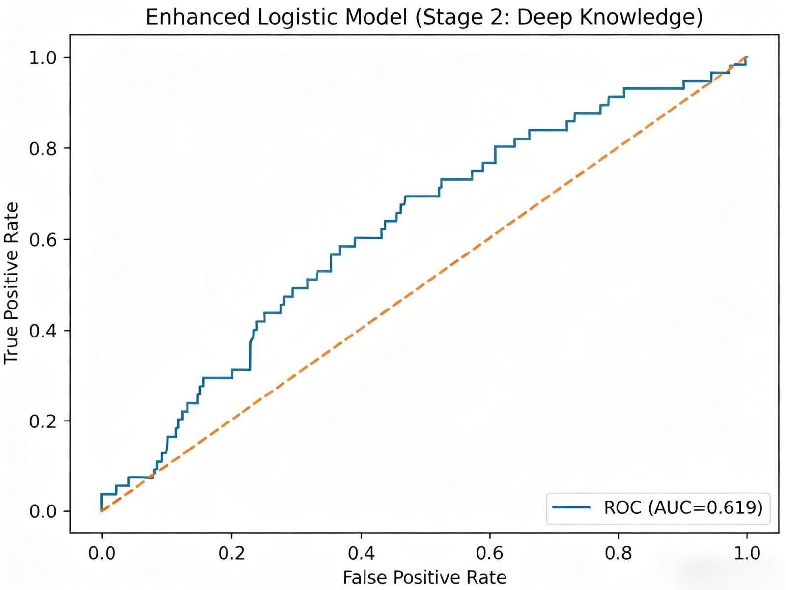 在估计方法上,本文采用极大似然估计,报告回归系数、优势比(OR)、95%置信区间及平均边际效应(AME),以增强结果的可解释性。同时,为了保证模型的外推能力,本文引入5折交叉验证方法,分别计算模型的ROC曲线下面积(AUC)与Brier分数,以检验模型在区分能力与概率校准方面的表现。最后,绘制ROC曲线直观呈现模型在不同判别阈值下的性能。