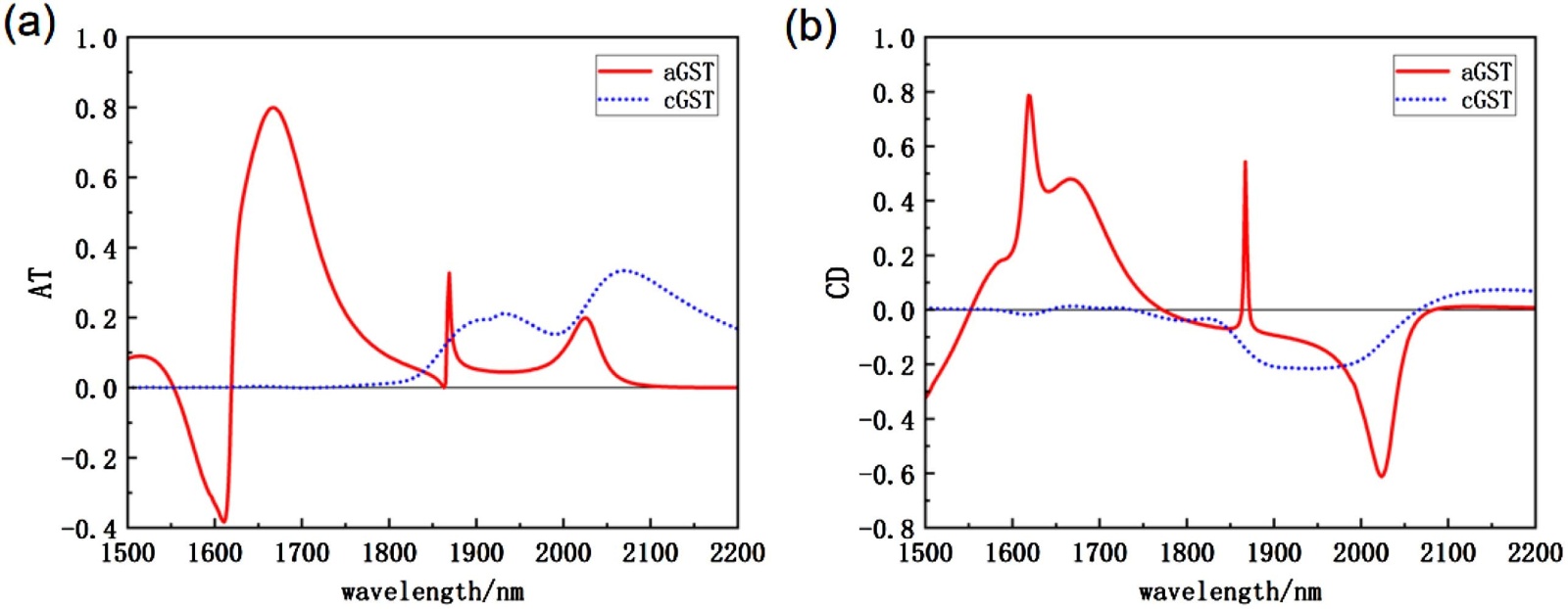 Figure 4. (a) AT curves of the metasurface; (b) CD curves of the metasurface