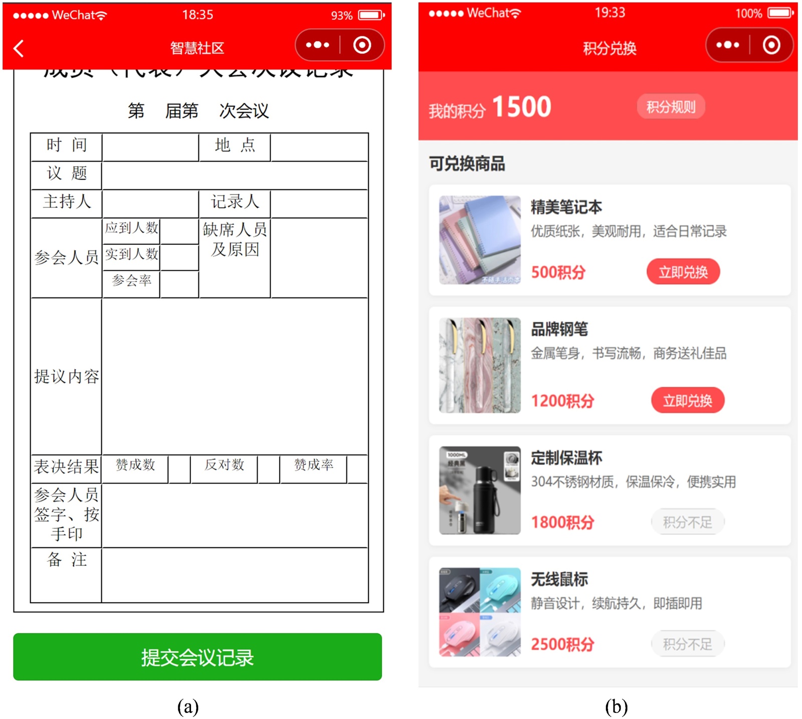 图4. 其他页面,(a) 会议记录页面;(b) 积分兑换页面