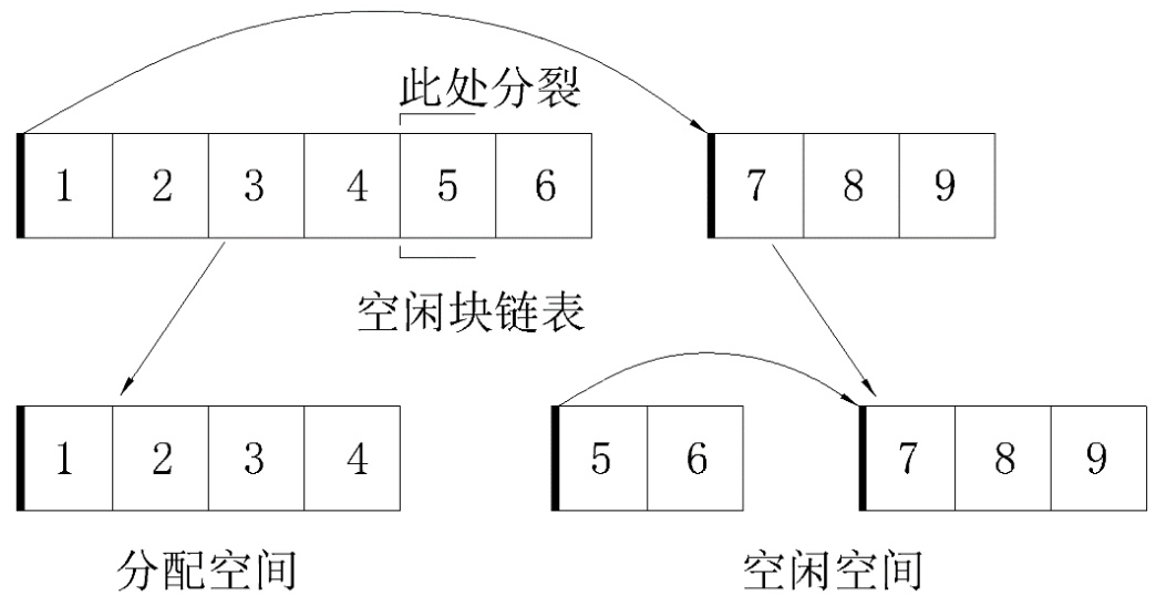分配的空间如果不再使用,需要释放变为空闲空间。有两种方式将释放空间合并到空闲块链表,即放在头部或者尾部。对于不考虑磨损的内存介质来说,放在头部通常更快,因为下次查询的路径可能较短;但对于考虑磨损的介质来说,放在尾部则更好,因为下次可以优先使用较新的部分,避免刚使用的空间再次磨损[6] [7]。