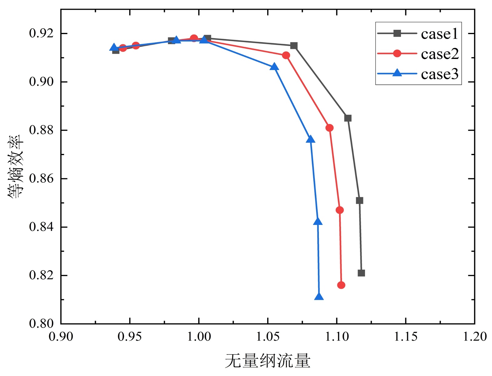 CFD数值计算结果对比如图7、图8所示,从case 1到case 3,堵塞流量逐渐减小,流量范围逐渐左移,这也验证了前面对叶型的分析,case 1由于喉道面积更大,堵塞流量更大。在总压比特性对比上,case 3的峰值压比最大,case 2其次,case 1的总压比最低。在效率特性曲线的对比上,峰值效率基本没有差距,但是在大流量工况下,case 1的等熵效率较高。