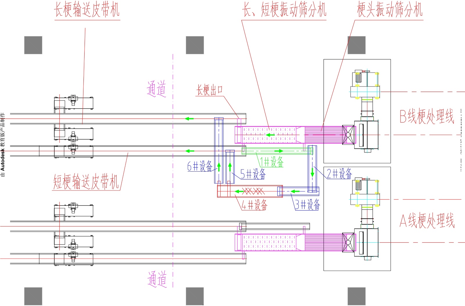 2#3#短梗二次复筛运输带;4#短梗二次复筛设备;5#短梗运输带;6#短梗运输带