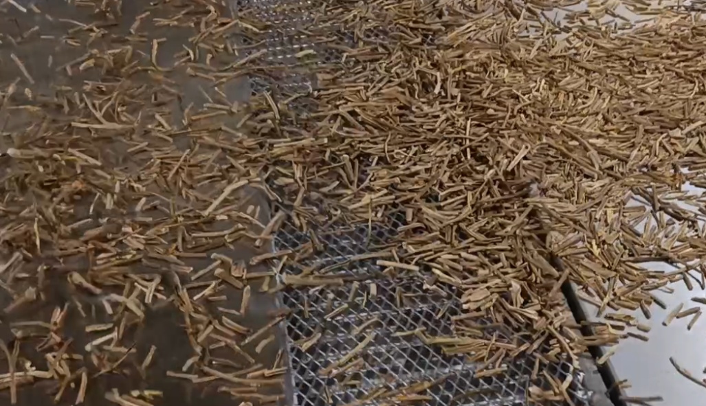 表2数据表明,既能满足长梗合格率,又能降低短梗中含长梗的比例的组合是二层筛面采用菱形10 × 18,使用宽度为400 (振槽宽1400)。如图12所示,明显有部分梗从二层筛面筛出,表明双层筛观察与数据情况一致。