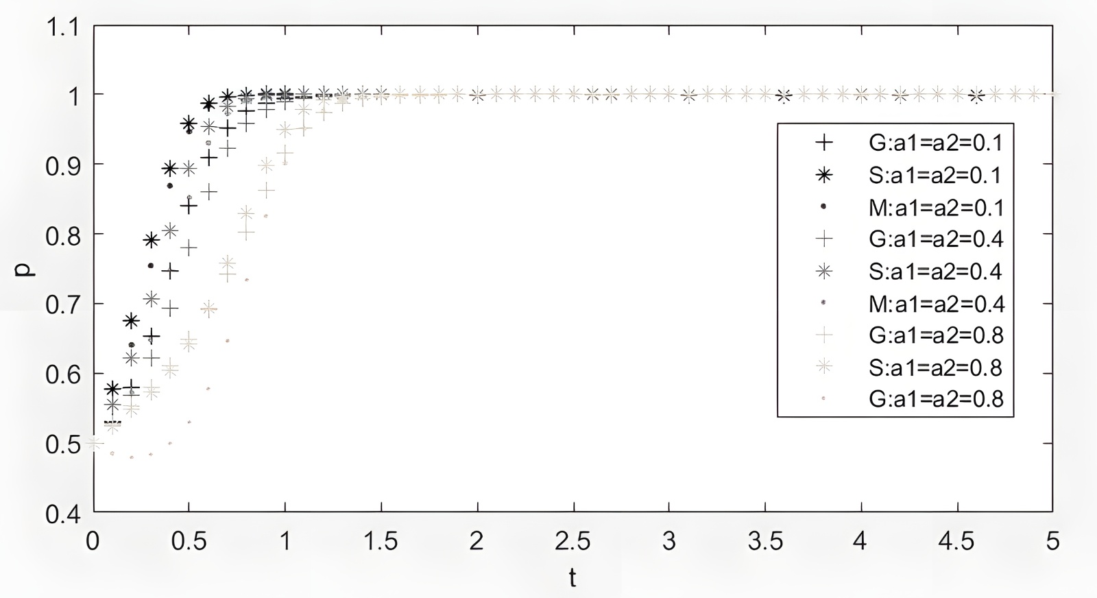 当a1和a2较高时,x,y,z趋于1的速度较慢。随着a1和a2的降低,x,y,z趋于1的速度也随之加快。生产性服务企业参与意愿的收敛速度最快,随着a1和a2由高到低,先进制造企业参与意愿的收敛速度逐渐快于政府参与意愿。