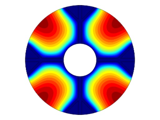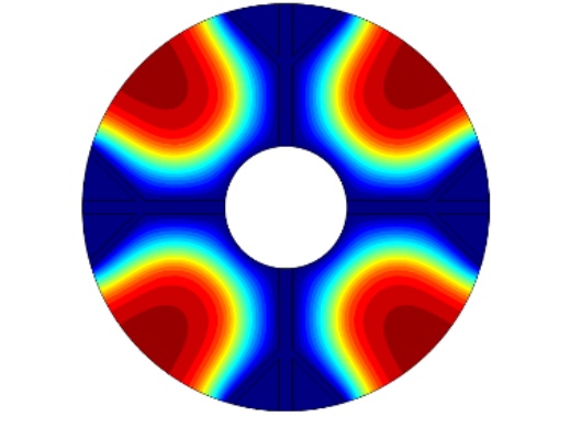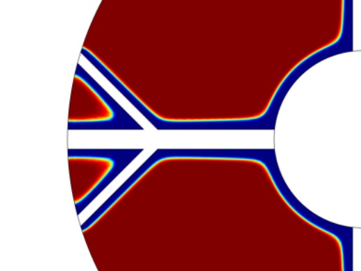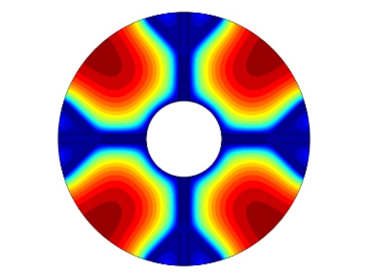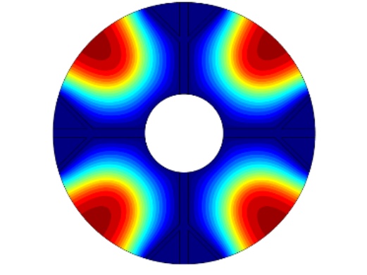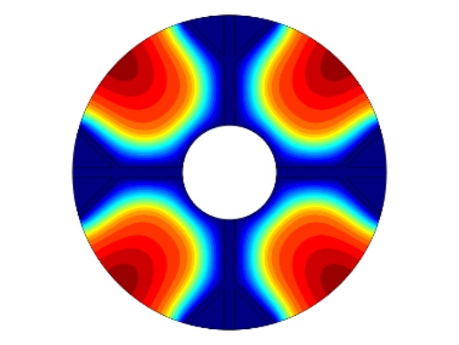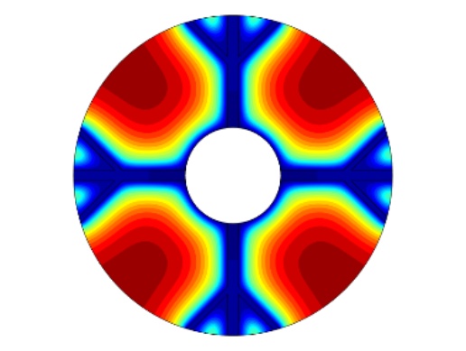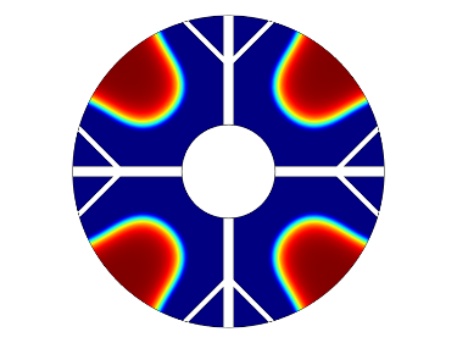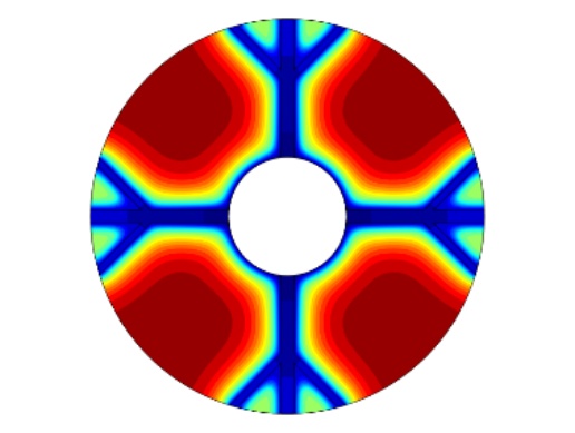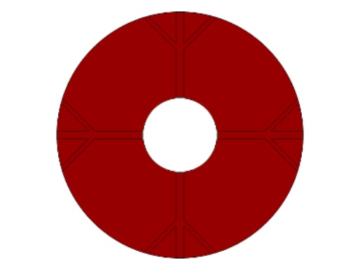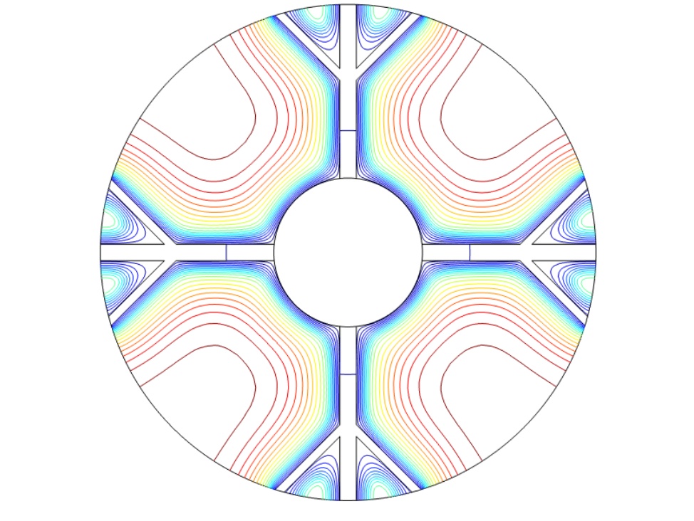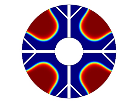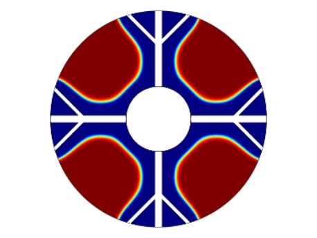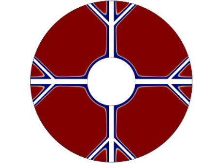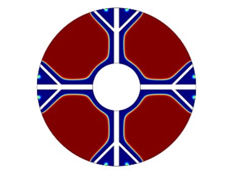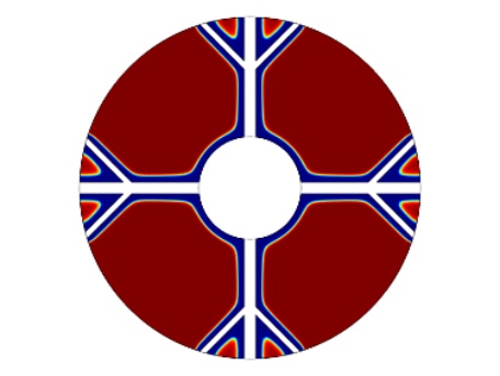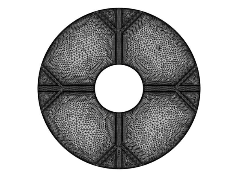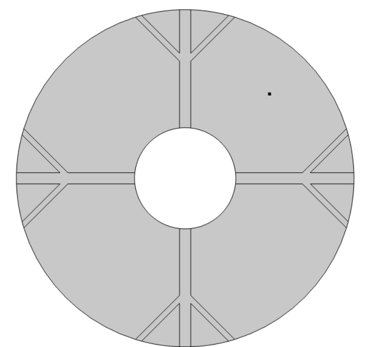 图1为物理模型,整体换热器的直径为150 mm,内部管道的直径为45 mm,肋片分支数为4,肋片级数为2,主肋片的宽度为5 mm,树状肋分支的宽度为2.5 mm,两个分支肋片的夹角为90˚,设置的重力加速度大小分别为9.8 m/s2、0.98 m/s2、0.0098 m/s2,其中进行温度分析的点的位置为(37.5, 37.5)。为了简化计算模型,我们假定:1) 模型的内流通管壁温度近似定值,内部管道流经低温流体,且整个储热设备的体积不大,模型的外部设置为保温层,看成储热设备和外部处于近似绝热状态。2) 熔融态时的相变材料属于弱可压缩流动,相变时相变材料的体积近似不变各向同性。3) 整个计算模型初始时的温度一致。4) 相变区域的月桂酸看成各向同性材料,热膨胀系数为0.00011 [1/K]。5) 忽略肋片与相变材料以及相变材料与内管壁之间的接触热阻。6) 固–液相相交的界面处温度是连续的。根据上述假设,建立控制方程如下: