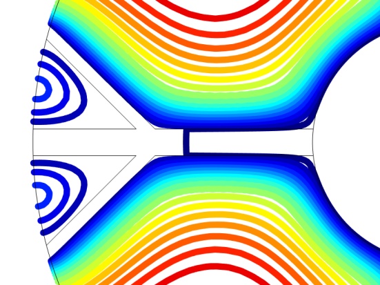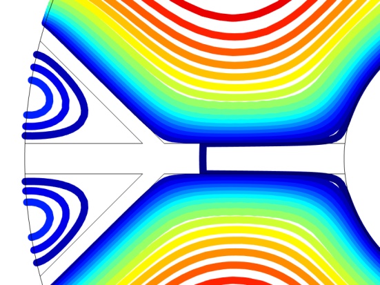 R = 75 mm处,外边界属于热绝缘;R = 22.5 mm处,恒定低温条件,n表示法线方向,内管道温度为恒定温度T,