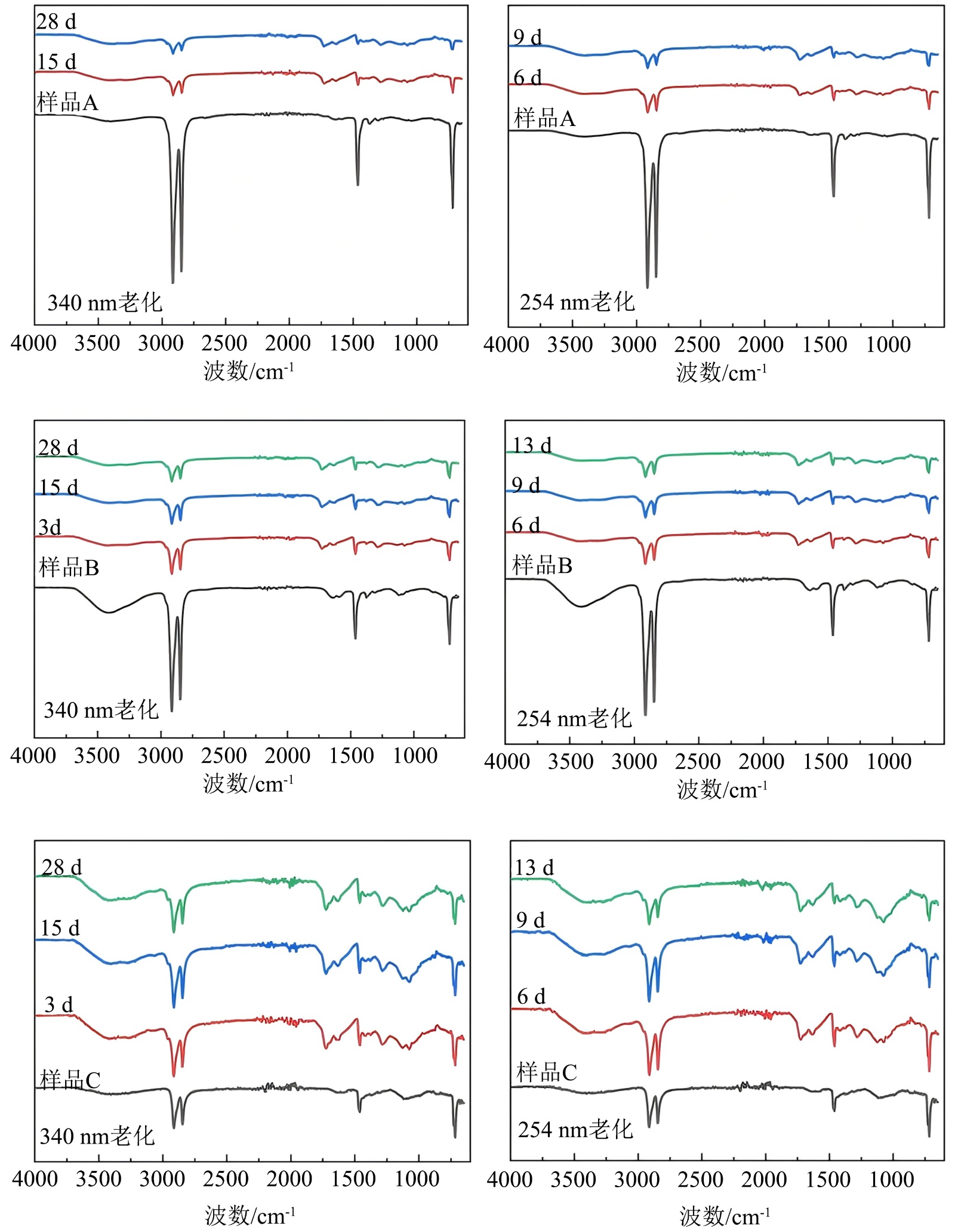 图1是样品A、B、C老化前后紫外可见光谱图;由图可以看出样品A、B原样在不同UV下可见光区间反射率(R%)变化不大,图几乎呈一条直线,R%在97%左右;而C样品则在250~400 nm区间有吸收,R%在45%左右,表明C样品中添加的是可吸收紫外光的物质,多为光敏剂或光敏基团;A、B、C样品在250~400 nm区域R%随着照射时间增长均呈现下降趋势,表明样品降解过程中生成双键、含氧官能团等吸光基团,随着老化时间的增长,吸光基团产生越多,R%越低。对比两个波长下的降解效果,从图中可以看出254 nm波长辐照下,样品降解效果均明显强于340 nm,即便是C样品中本身存在着吸光基团,也能看出254 nm辐照下产生了更多的吸光基团。