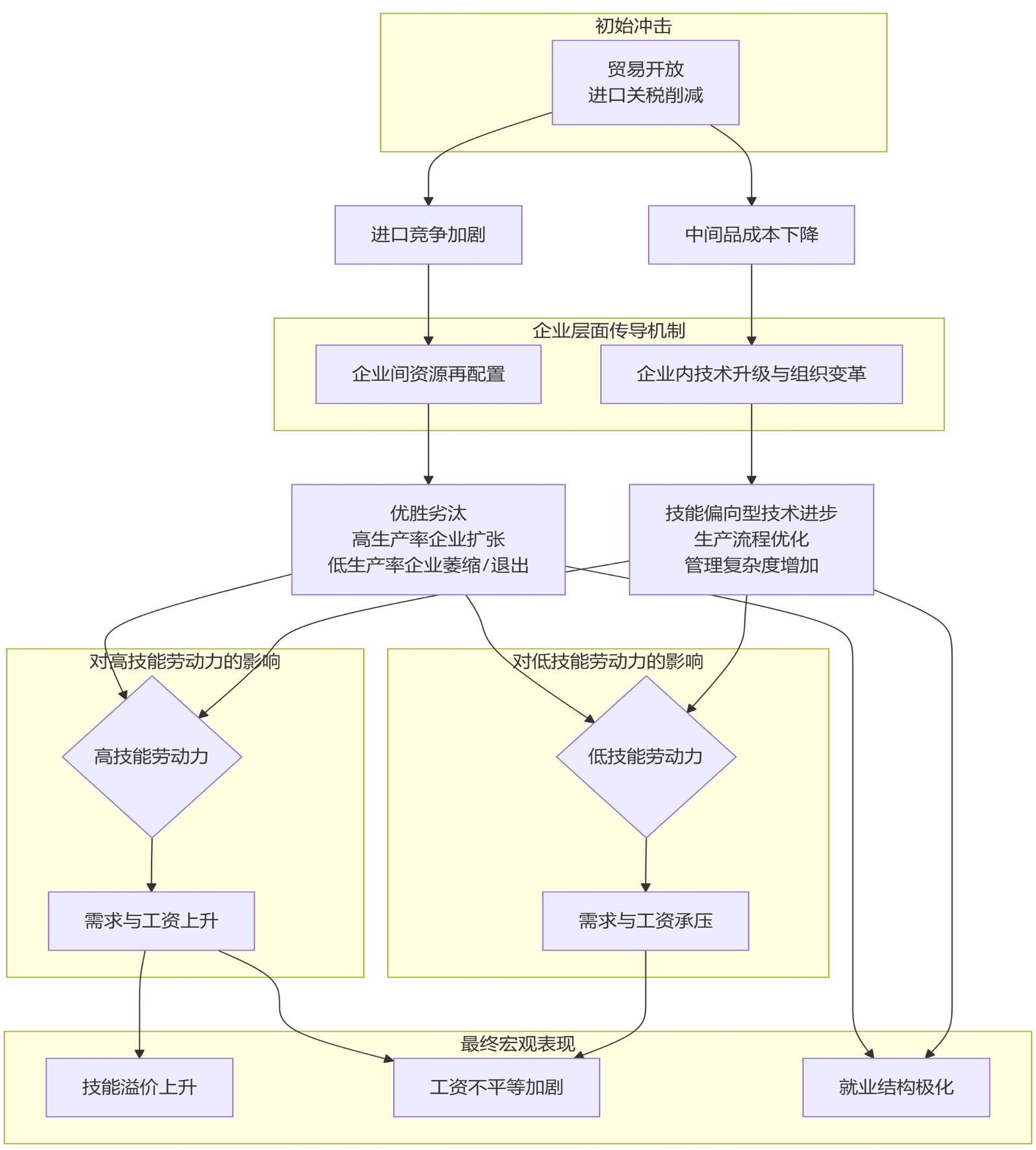 图1. 贸易开放(以关税削减为例)影响劳动力市场的传导机制