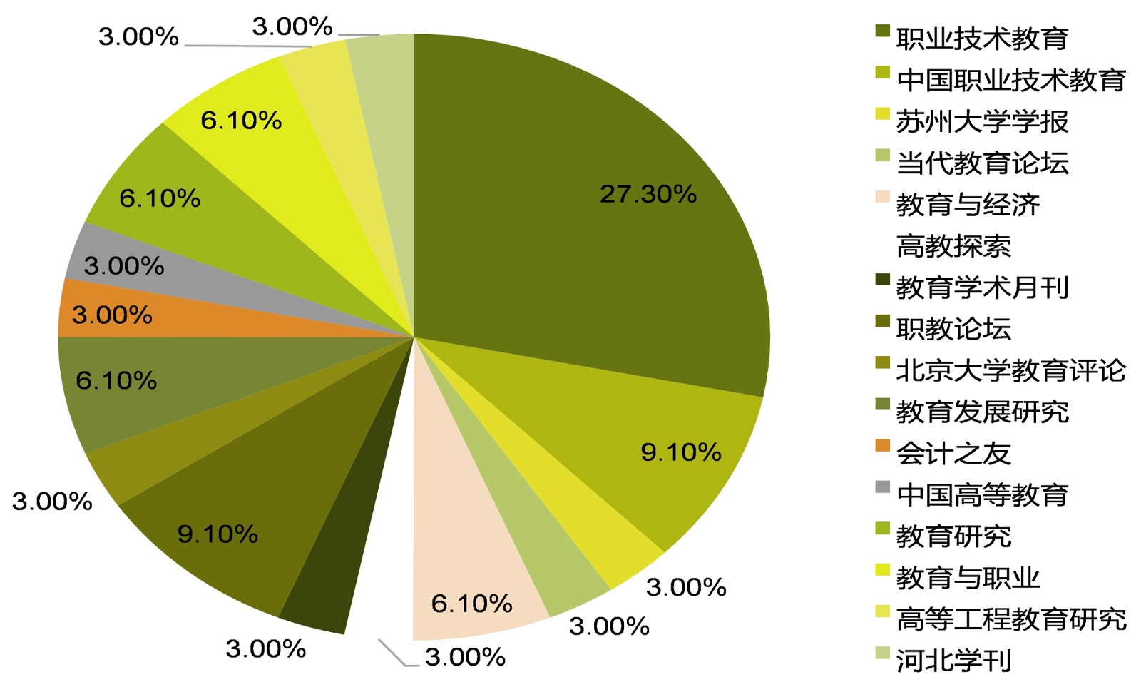 32篇核心期刊文章发表在16种期刊杂志上,涵盖教育类、经济与管理类、综合性社科类三个类别。其中绝大多数为教育类期刊,共14种,约占87.5%,经济与管理类约占6.25%,综合性社科类约占6.25%。从发表论文的数量来看,《职业技术教育》发表的论文最多,达到9篇,占27.3%;《中国职业技术教育》和《职教论坛》各发表论文3篇,各占9.1%;《教育与经济》《教育发展研究》《教育研究》《教育与职业》各发表论文2篇,各占6.1%;《苏州大学学报》(教育科学版)、《当代教育论坛》《高教探索》《教育学术月刊》《北京大学教育评论》《会计之友》《中国高等教育》《高等工程教育研究》《河北学刊》各发表1篇,各占3.0% (如图1所示)。筛选出的7篇学位论文学位授予单位分别为北京交通大学(2篇)、财政部财政科学研究所(1篇)、东华理工大学(1篇)、武汉大学(1篇)、天津财经大学(1篇)、苏州大学(1篇)。