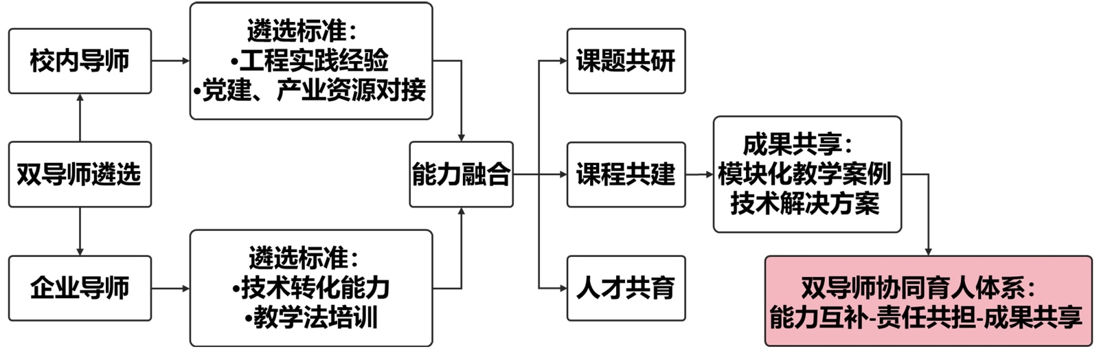 在“双导师”协同机制的完善过程中,环工学院重点关注提升导师的复合能力,充分融合产业技术前沿与工程教育的实际需求,打造了一个“能力互补–责任共担–成果共享”的新型育人体系(图1)。学院依托卓越工程师培养计划,系统优化导师遴选标准:校内导师侧重工程经验的积累,要求具有主持或参与漓江治理、农村污水低碳处理等实际工程项目的经历,且其工程经验年限需满足既定标准,校内导师还需积极主动对接“党建 + 产业”平台的资源,确保教学设计与区域生态治理紧密联系;企业导师则侧重于教学内容的转化能力,从博世科环保、桂润环境等合作企业中选拔技术骨干,通过定制化的教学法培训,促使其将污染控制、碳中和等技术攻关经验转化为模块化的教学案例,与此同时,企业导师定期进校授课,与校内导师分享最新工程案例,合作升级教案与教材。这一机制突破了传统校企合作中表面化的接触,形成了涵盖“课题共研–课程共建–人才共育”的责任共同体。