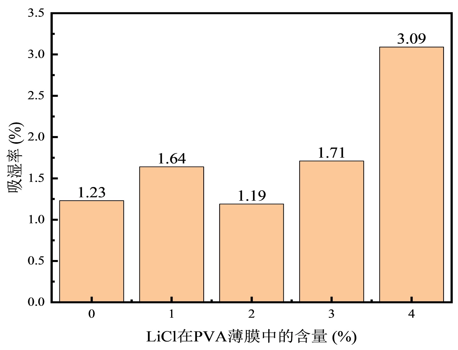图2. PVA薄膜吸湿率与LiCl在PVA含量的关系图