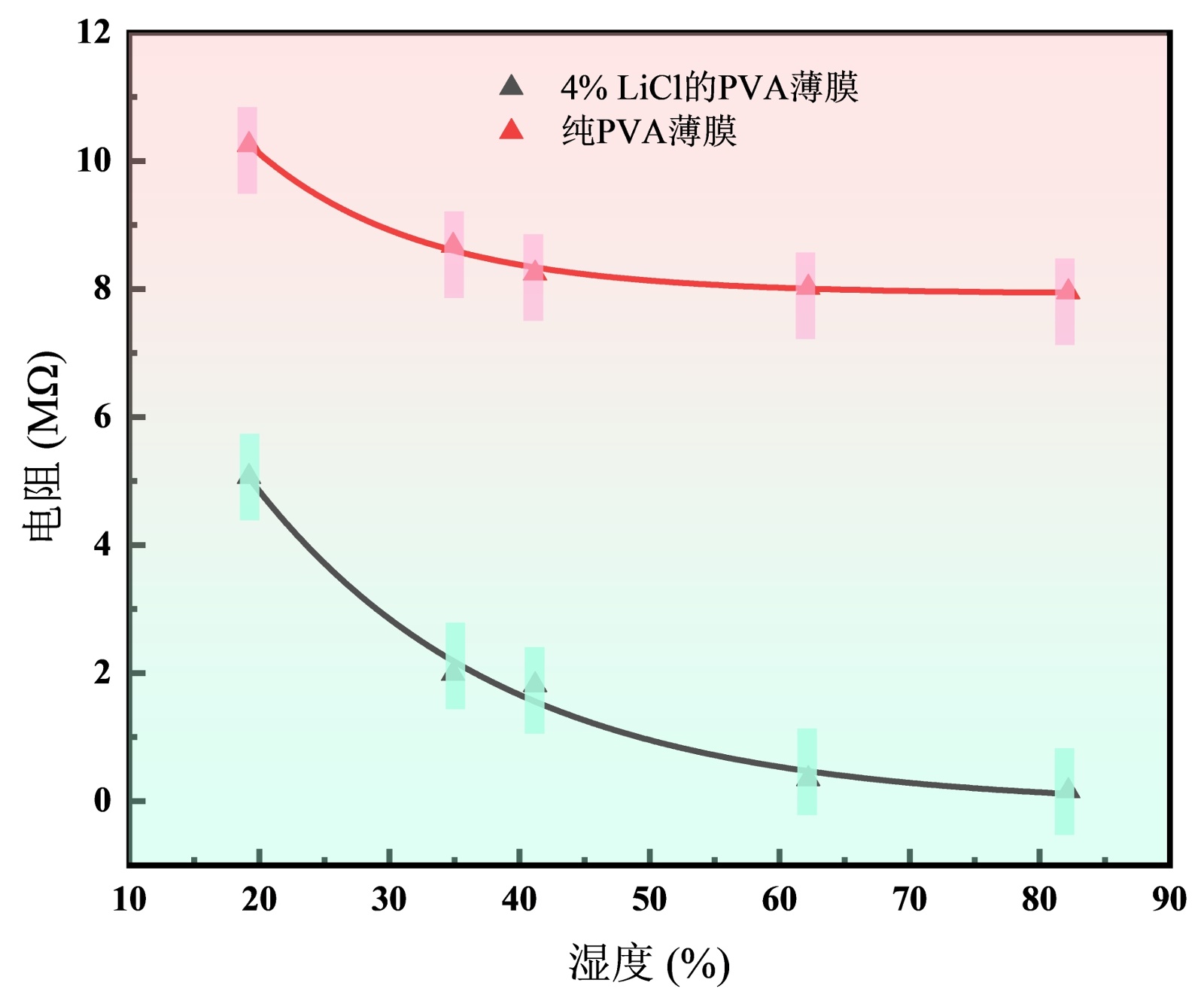 温度响应性能是PVA复合薄膜的重要指标,以4% LiCl的PVA复合薄膜为测试对象与纯PVA薄膜在不同湿度环境下进行湿度响应性对比。其测试结果如图3中所示。