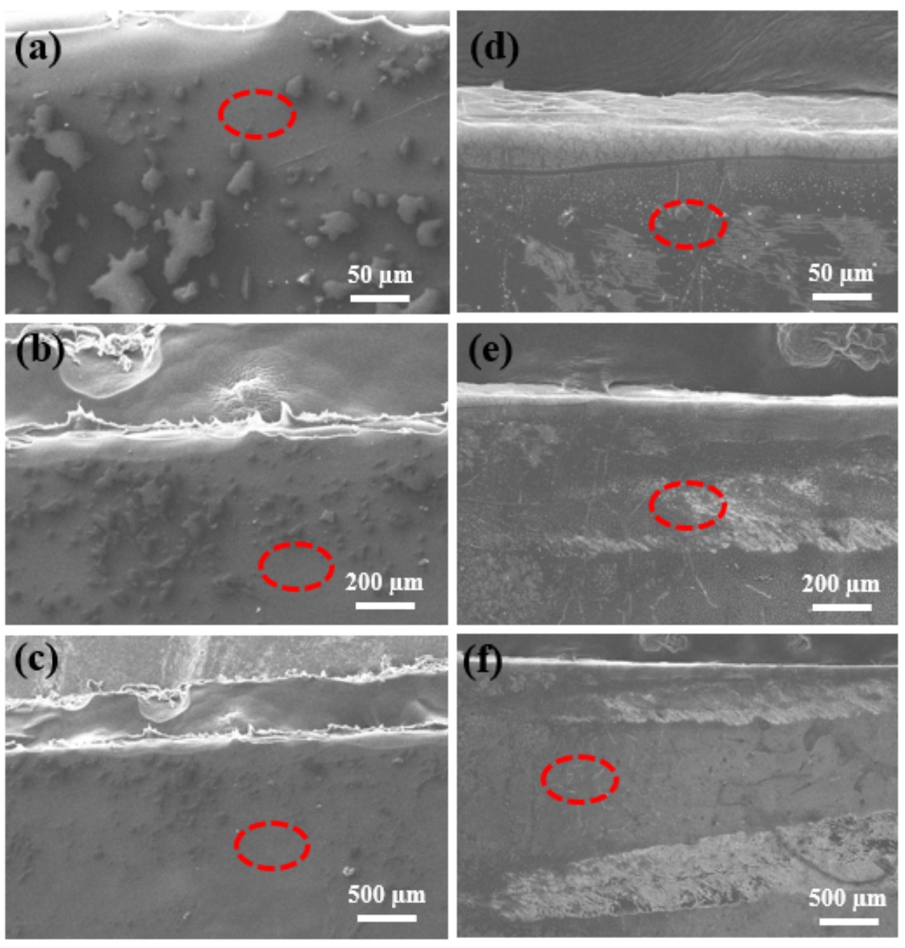 图4. PVA薄膜扫描电镜对比图((a),(b),(c)为纯PVA薄膜,(d),(e),(f)为添加4% LiCl的薄膜)