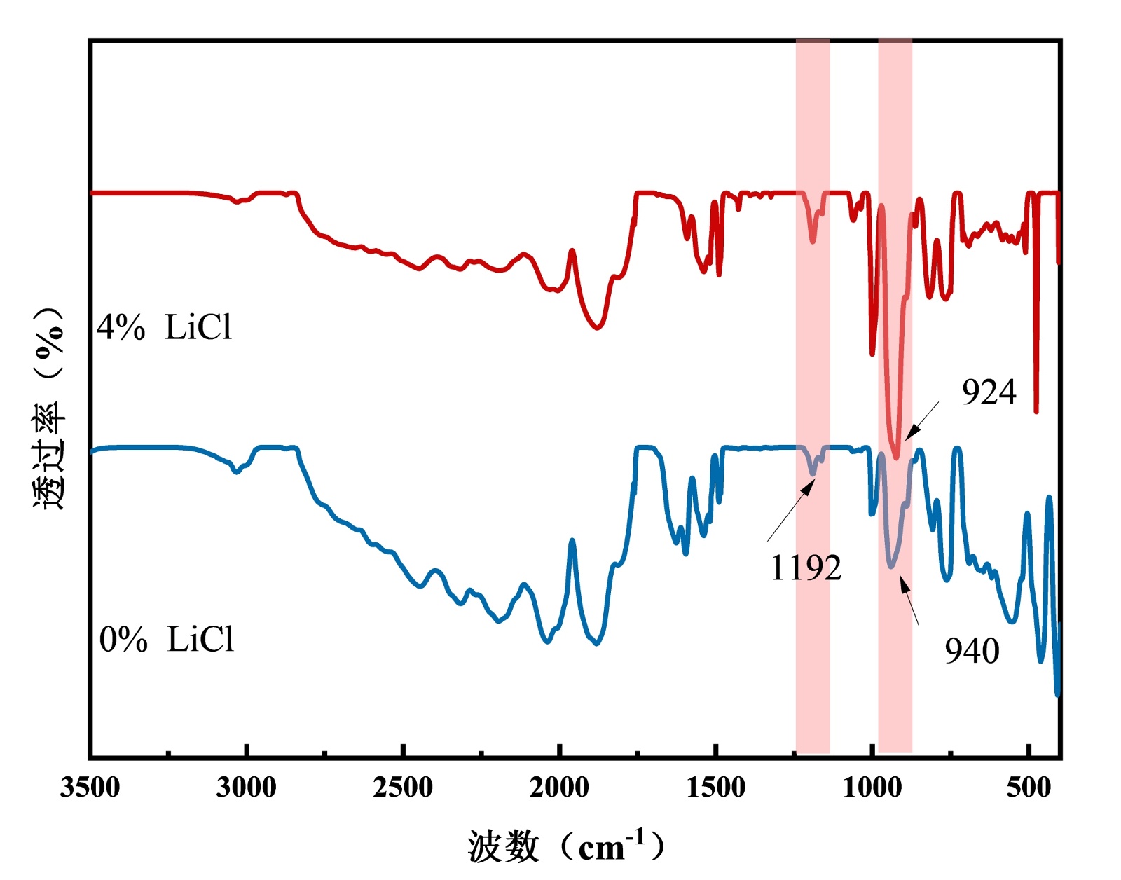 图5. 添加不同含量LiCl的PVA薄膜的FT-IR结果