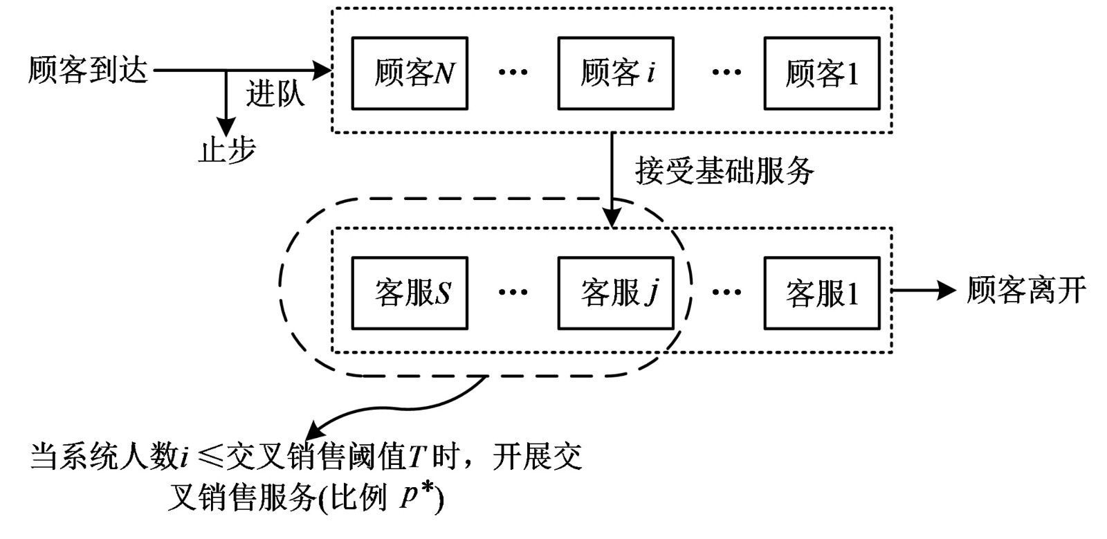 部分顾客进行交叉销售,其余顾客只进行基础销售,通过数值仿真,确定交叉销售最优比例。Armony等(2010) [2]表明,为了最大化交叉销售的预期稳态收入以及等待时间较低,只有当系统中的客户数量小于阈值时,才能启动交叉销售活动。而Armony等(2018) [3]进一步从阈值角度探讨何时开启交叉销售服务。在上述关于交叉销售比例、阈值的文献中,并未考虑到顾客行为对排队系统的影响,且大多从排队系统性能指标进行分析。
