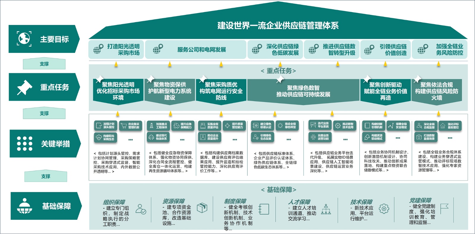 以保障供应链发展需要,围绕组织、人才、机制、资源等配置保障要素,以确保新发展阶段电网供应链深化绿色数智转型及管理持续改革创新,推动供应链管理体系升级,培育电网供应链核心竞争力。