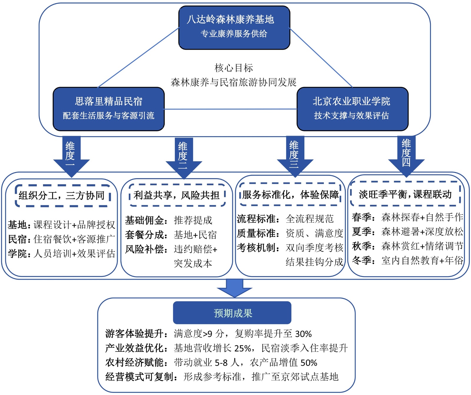 构建“八达岭森林康养基地 + 思落里民宿 + 北京农业职业学院”的三方合作主体,明确各主体职责与协作机制: