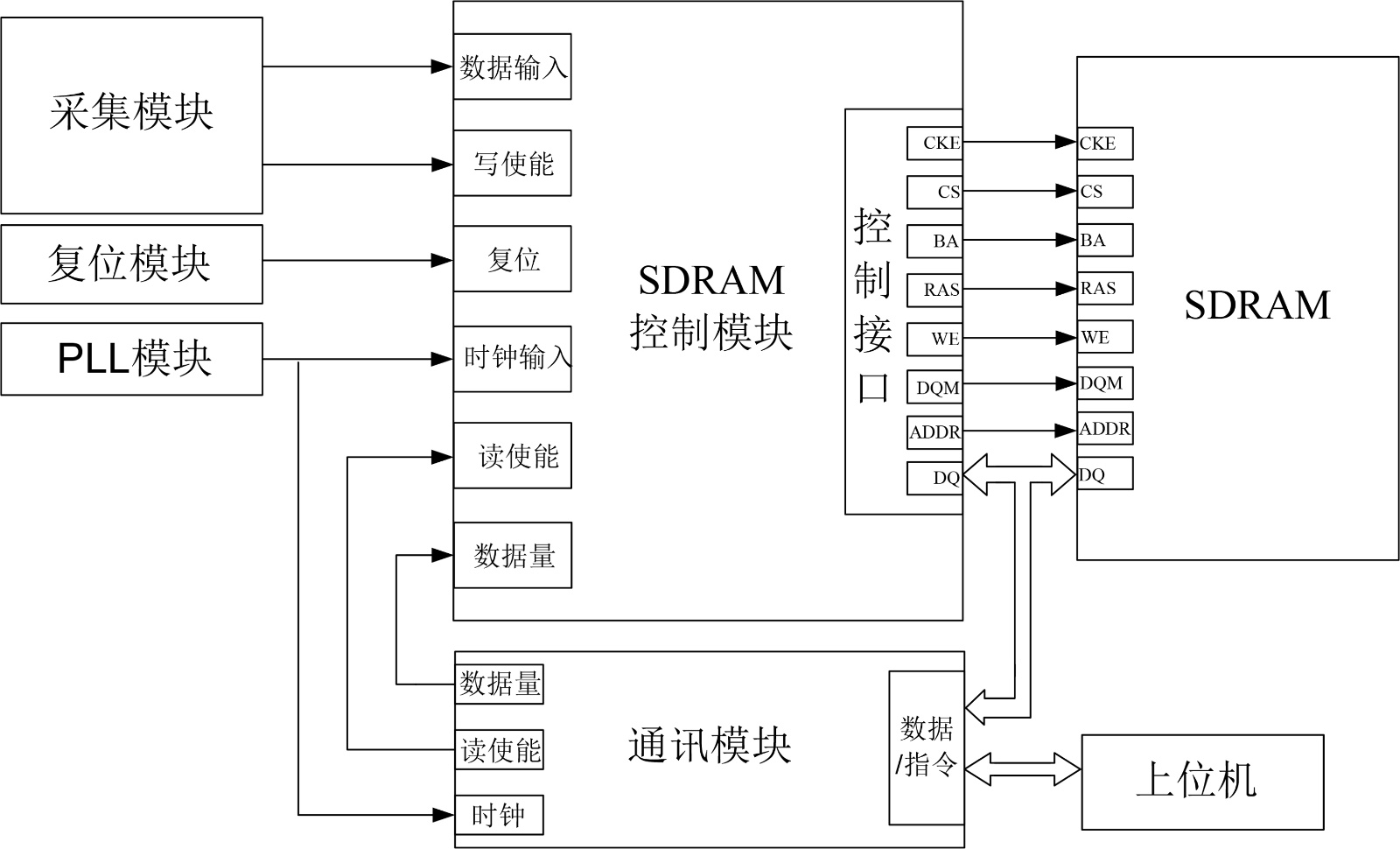 在电涡流传感器动态校准过程中,由于动态校准的最高频率为500 Hz,在一个周期内需要采集的数据点数设为200,则动态校准时需要的采样率为100 kSPS,如果选用简单的RS232通讯模块来进行数据传输,显然无法实现数据的实时传送,因此需要设计一个数据缓存器。在本装置的设计中选用的EP2C5Q208C8N核心板上附带有一片型号为HY57V641620的SDRAM,其存储容量大64 Mbit,能够满足存储器的设计要求,因此选用该芯片作为装置的存储器,控制系统存储器控制模块的原理框图如图1所示。