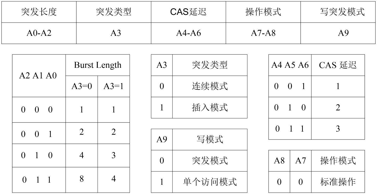 在进行模式设置时需要设置突发长度、突发类型、CAS延迟和读写模式寄存器。使用地址线A9~A0完成模式寄存器设置。其中A2~A0作为Burst长度,A3为Burst类型,A6~A4为CAS延迟。A8~A7为操作模式,A9为写Burst模式。模式寄存器的设置值如图2所示[9]。