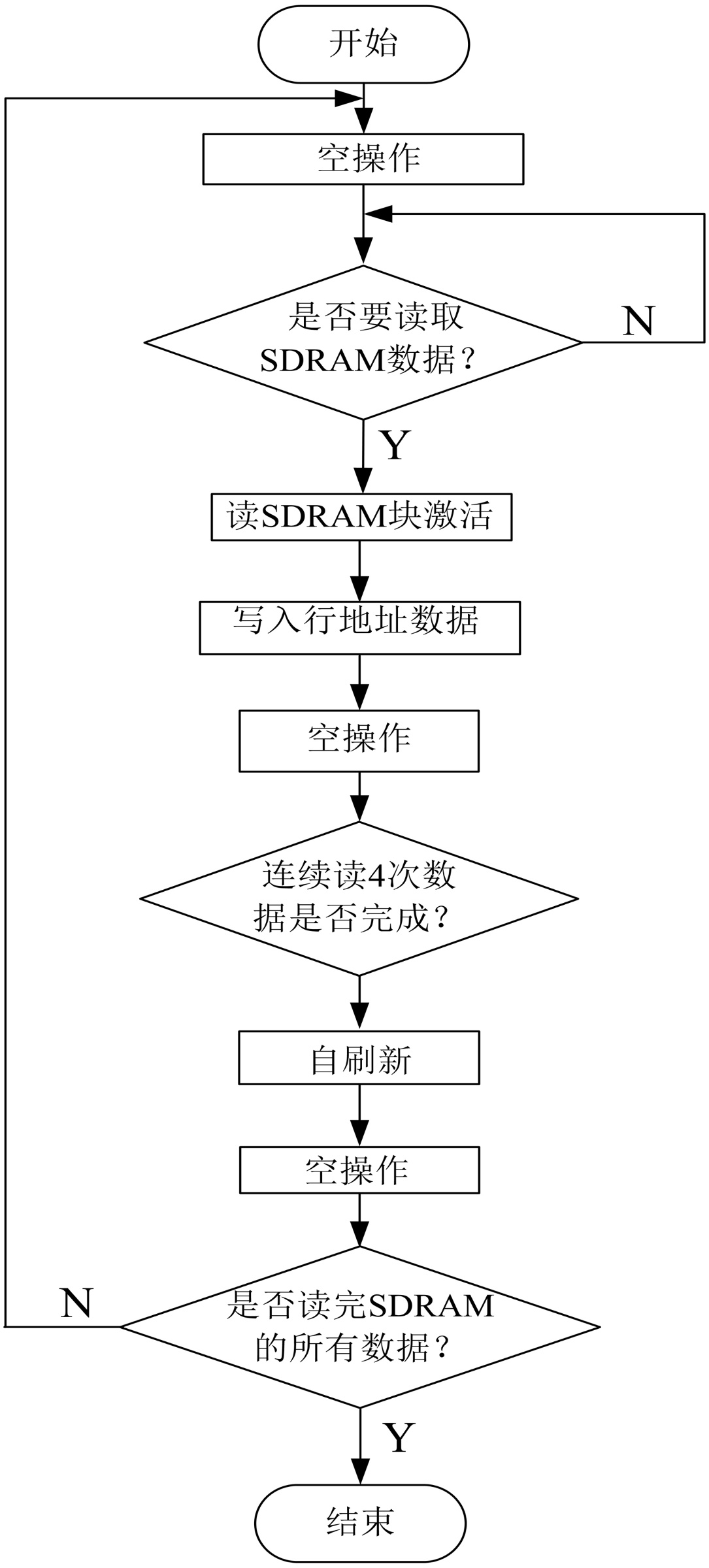 完成以上步骤后,SDRAM进入正常工作状态,等待控制器对其进行读、写和刷新等操作。在进行SDRAM控制时需要进行刷新是因为存储体中电容的数据有效保存期上限是64 ms,因此在使用SDRAM之前要执行自刷新的命令。等待需要写入数据的使能信号的上升沿,该使能信号由ADS1271数据采集模块提供,如果有上升沿到来,说明有数据要写入到SDRAM,则进入行激活操作。激活命令处于空闲状态存储体的任意一个行,使之进入准备写状态。如果没有写数据上升沿到来,则在这个状态等待。将空闲状态的行激活后需要写入列地址以确定需要写入的数据的存储地址,存储地址确定后将数据写入数据总线,完成一次数据的写入,然后进行一次自刷新,并判断需要写入的数据量是否已经写完,如果还有数据需要写入则等待下一个数据的到来,如果已完成所有数据的写入则结束对SDRAM的写操作。完成SDRAM的写操作后,数据被保存到SDRAM中等待被读取。当读使能信号到来时,对SDRAM数据进行读取,根据模式寄存器的设置要求,连续进行4次的读操作,由于数据为48位数据,因此最后一次读取的数据无效,在后期处理时会被删除。完成4次连续的读取之后,执行一次自刷新和空操作,完成一次48位数据的读取,依此循环,直至将SDRAM直至将SDRAM中的所有数据读完,从而完成对SDRAM的读写操作。SDRAM的写与读控制流程分别如图3和图4所示。