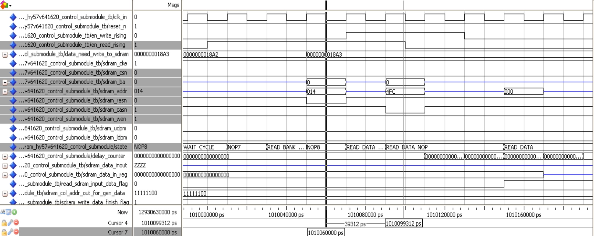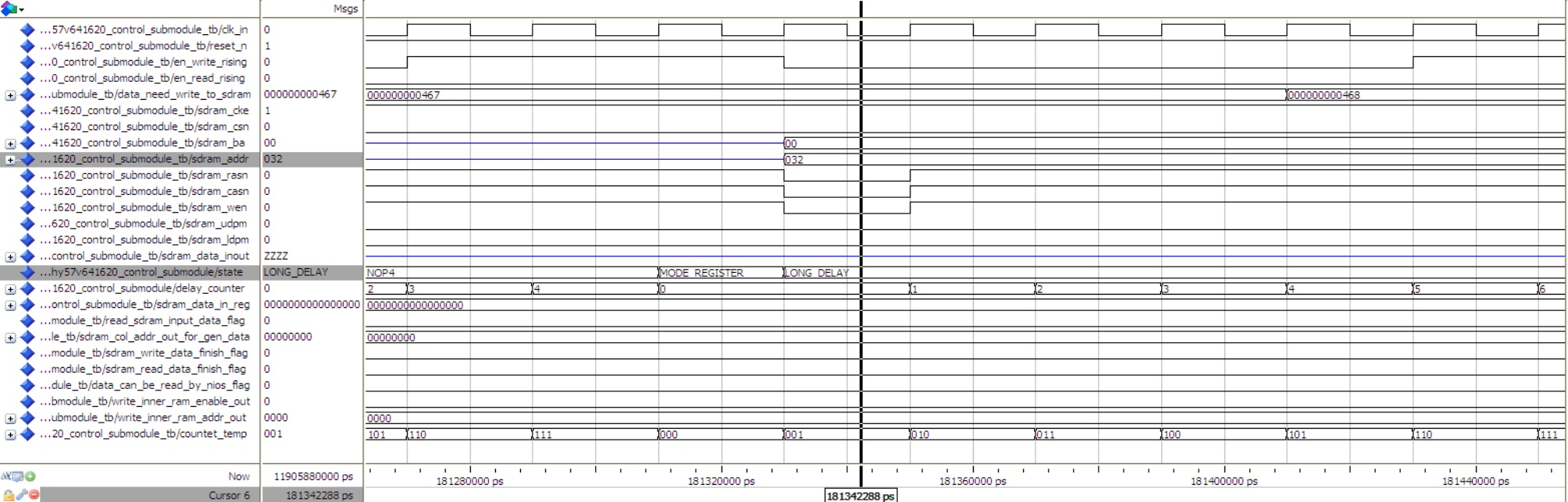 图5是模式寄存器控制的仿真图,图中高亮的两个信号分别为sdram_addr和state,此刻在竖线的state位置处表示在进行模式寄存器设置,而sdram_addr此时代表的是设置寄存器的具体值,即sdram_addr的第0-2位为010表示选择的是突发操作长度为4个字节。sdram_addr的第3位为0表示选择的是连续突发的操作。sdram_addr的第4~6位为011表示选择的是3个时钟的延迟。sdram_addr的第9位为0表示选择的突发模式。