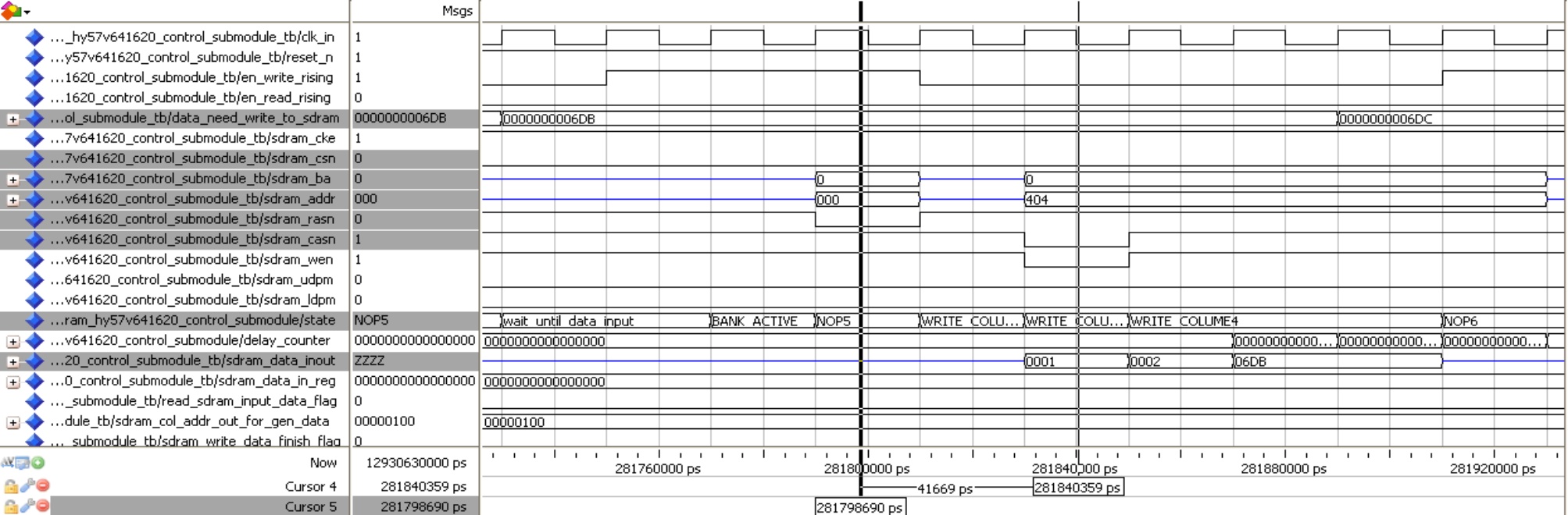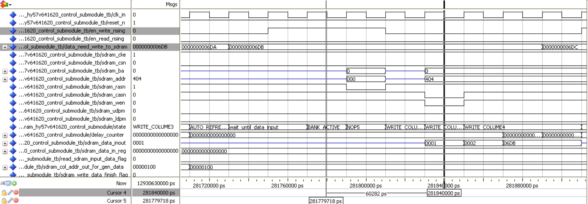 上图中灰色标记的信号分别为sdram_csn,dram_rasn,sdram_casn,sdram_addr,sdram_ba,sdram_data_inout,data_need_write_to_sdram和state,其中sdram_csn是片选信号,sdram_rasn选择行信号,sdram_casn选择列信号,sdram_addr是行或者列数据,sdram_ba是块数据,sdram_data_inout是SDRAM的16位双向IO数据信号,data_need_write_to_sdram是要写入到SDRAM的数据,state是控制SDRAM状态机的状态。在图中左边的竖线表示进入了块激活以及给了行选择信号及行数据,此时sdram_csn和sdram_rasn为低,sdram_casn和sdram_wen为高与SDRAM控制协议一致。仿真中给定data_need_write_ to_sdram为0000000006D8,为了便于仿真验证,在sdram_data_inout中将data_need_write_to_sdram的高16位、中16位和低16位分别进行加1存储、加2存储和直接存储。从图中右边竖线可以看出写操作时sdram_csn、sdram_casn和sdram_wen为低,sdram_rasn为高,与SDRAM控制协议一致,并将需要存储的数据正确地写入了SDRAM。