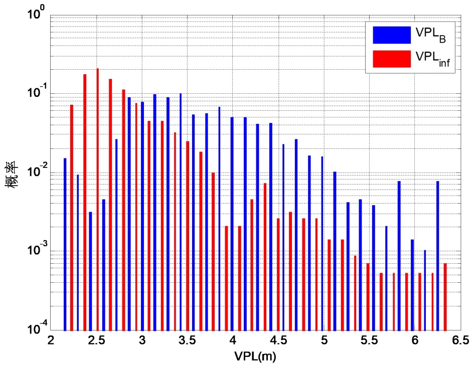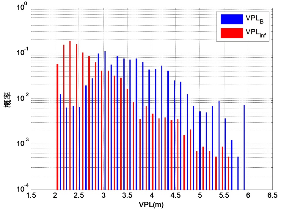 分别利用传统sigma膨胀算法和本文所提出的算法时得到的垂直保护水平仿真结果。其中VPLB和VPLinf代表分别利用sigma膨胀算法和本文所提出的改进算法所确定的用户端垂直保护水平。