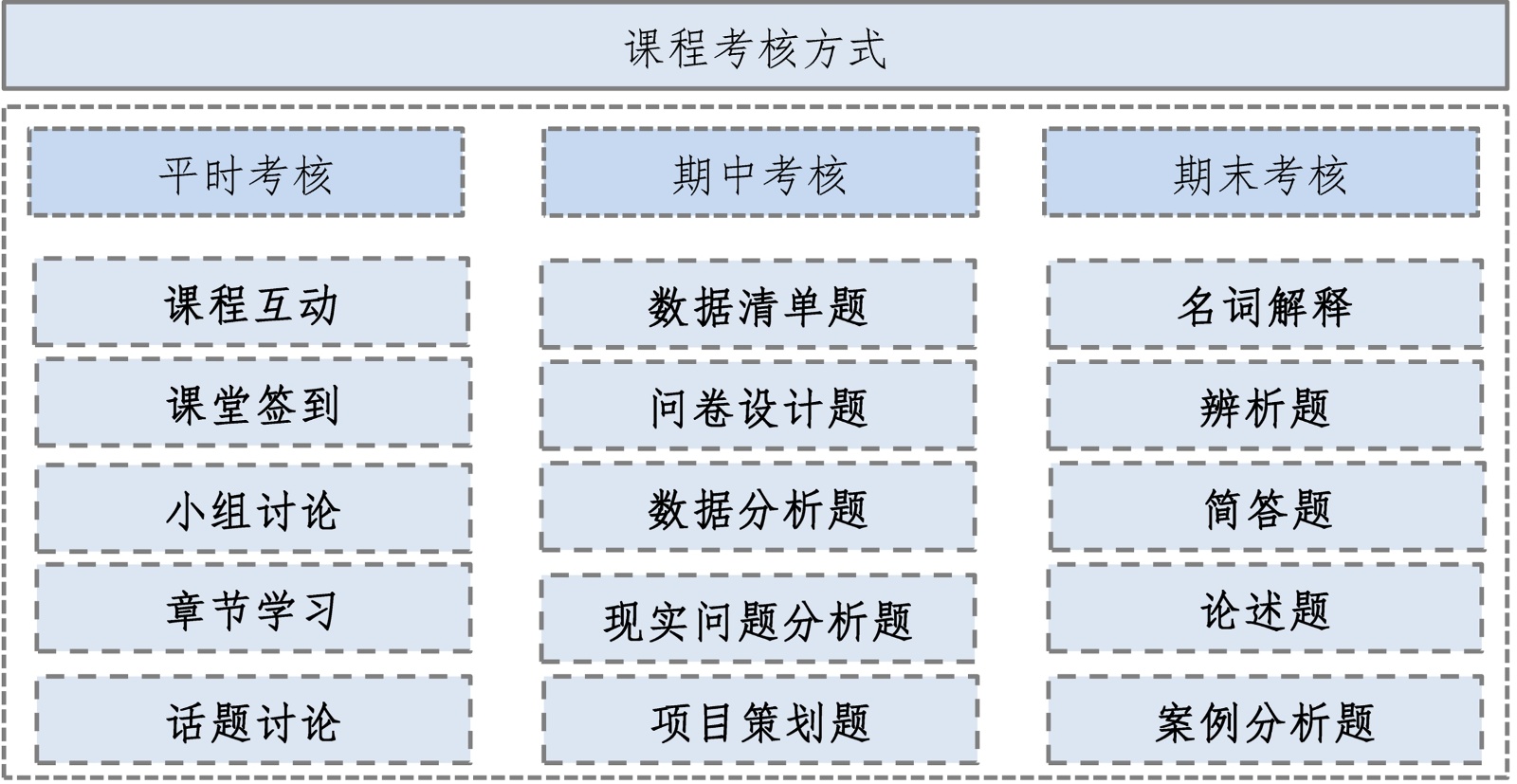 考试总评成绩由平时成绩,期中成绩和期末成绩组成,其中平时成绩和期中成绩占到60%,期末成绩占到40%。平时成绩由课堂互动、课堂签到、小组讨论、章节学习、话题讨论等组成。期中成绩通过3次过程性考核进行评价,平时成绩、期中成绩和期末成绩均按照百分制评定,再分别按照所占比例计算得出总评成绩。通过课程考核方式创新,构建了由平时考核、期中考核、期末考核为辅的综合考核方式,探索出适用于课程平时考核方式,包括小组讨论、旅游问卷设计、在线学习、课堂互动、读书笔记等、期中考核题型(数据分析题、问卷设计题、项目策划题等)和总结出课程期末考试的命题题型(以能力考核题型为主,以记忆考核题型为辅)和内容(将旅游业营销最新的案例以及旅游营销前沿研究领域融入考试),详见图1。
