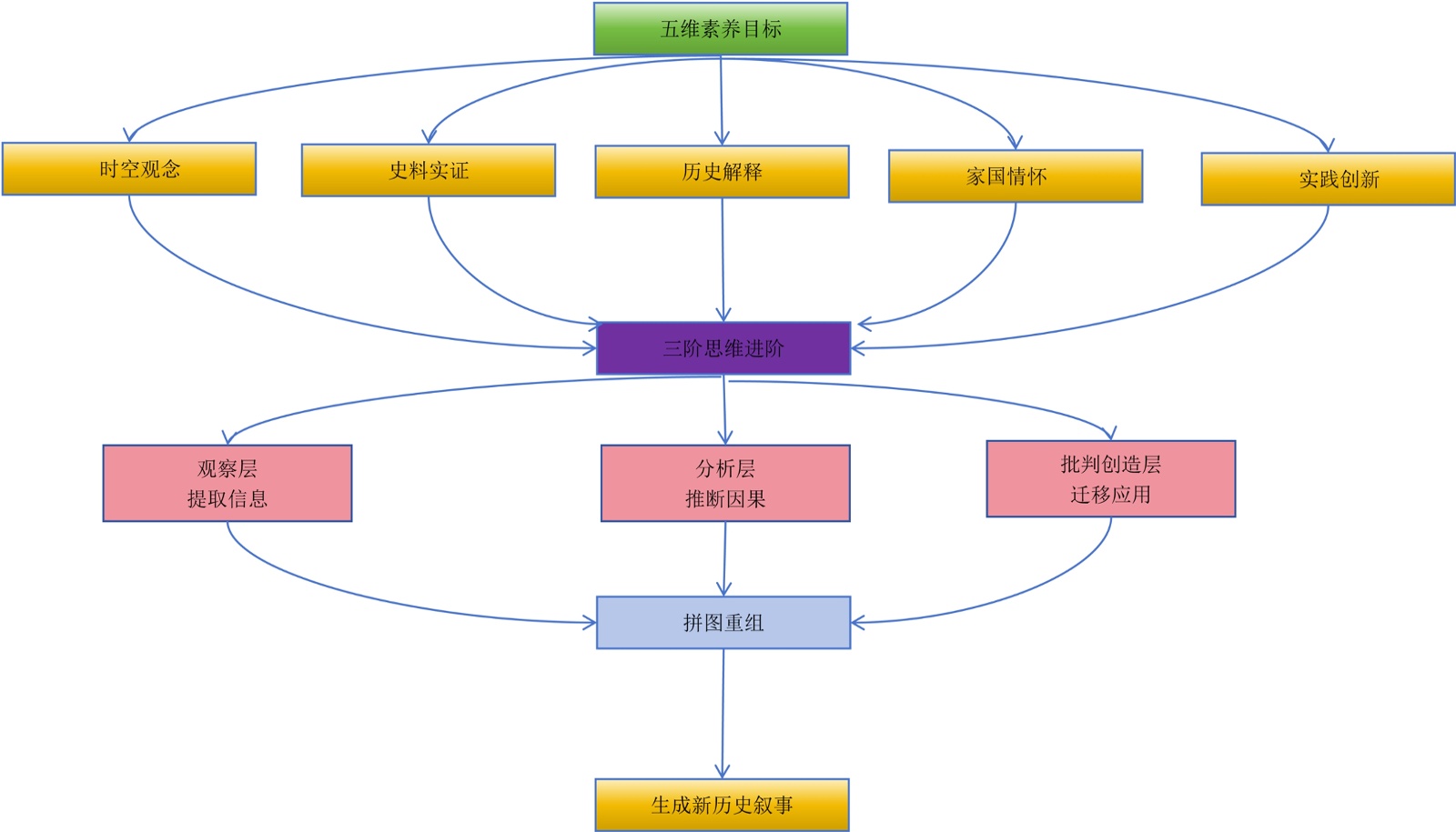 历史学科的五大核心素养分别为历史解释、唯物史观、时空观念、史料实证、家国情怀。此模式将这些核心素养具体化为每一幅插图的教学目标,确保了教学的方向性和育人价值。