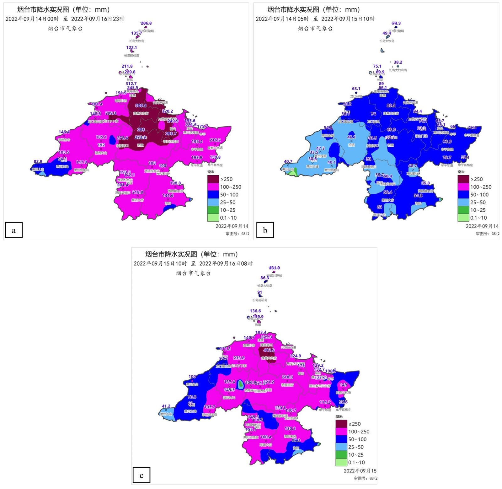 Figure 2. Distribution of precipitation (units: mm) in Yantai from 14~16 September 2022