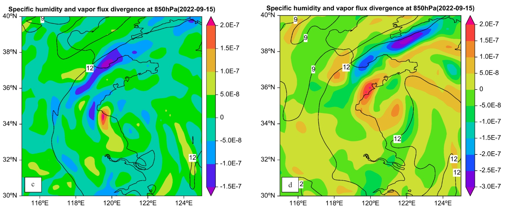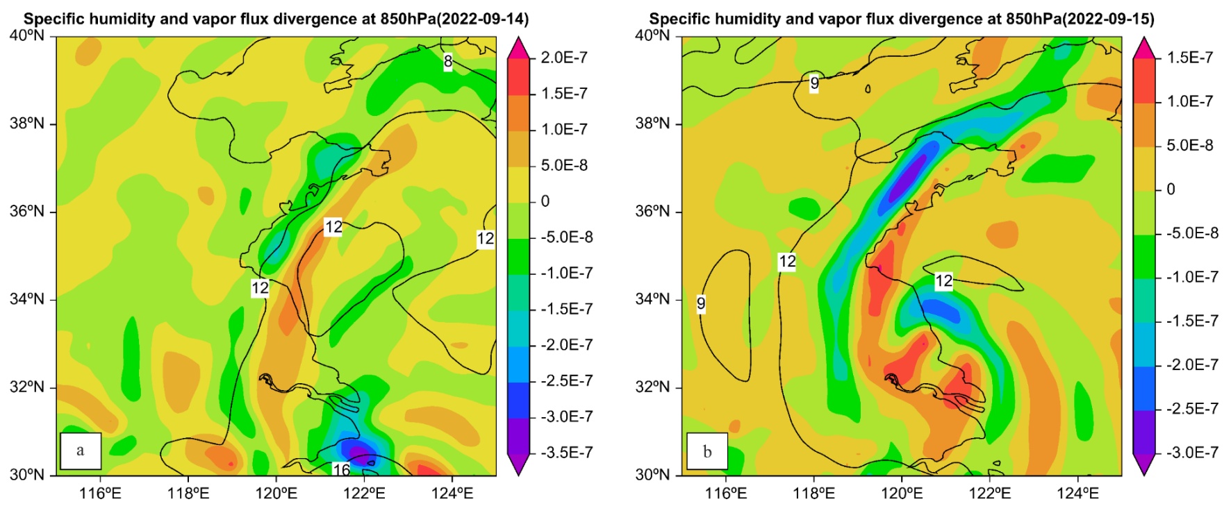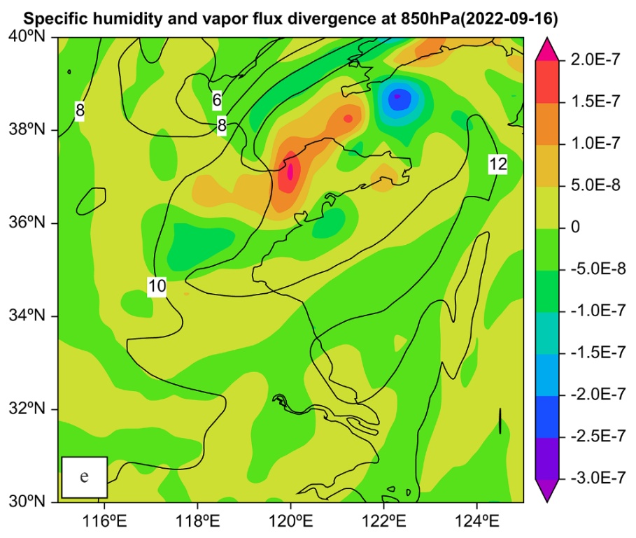 Figure 5. Specific humidity (solid line, units: g/kg) and vapor flux divergence (coloe scale, units: g/hPa/cm2/s) at 850 hPa at 20:00 CST 14 (a), 08:00 CST 15 (b), 14:00 CST 15 (c), 20:00 CST 15 (d) and 08:00 CST 16 (e) September 2022