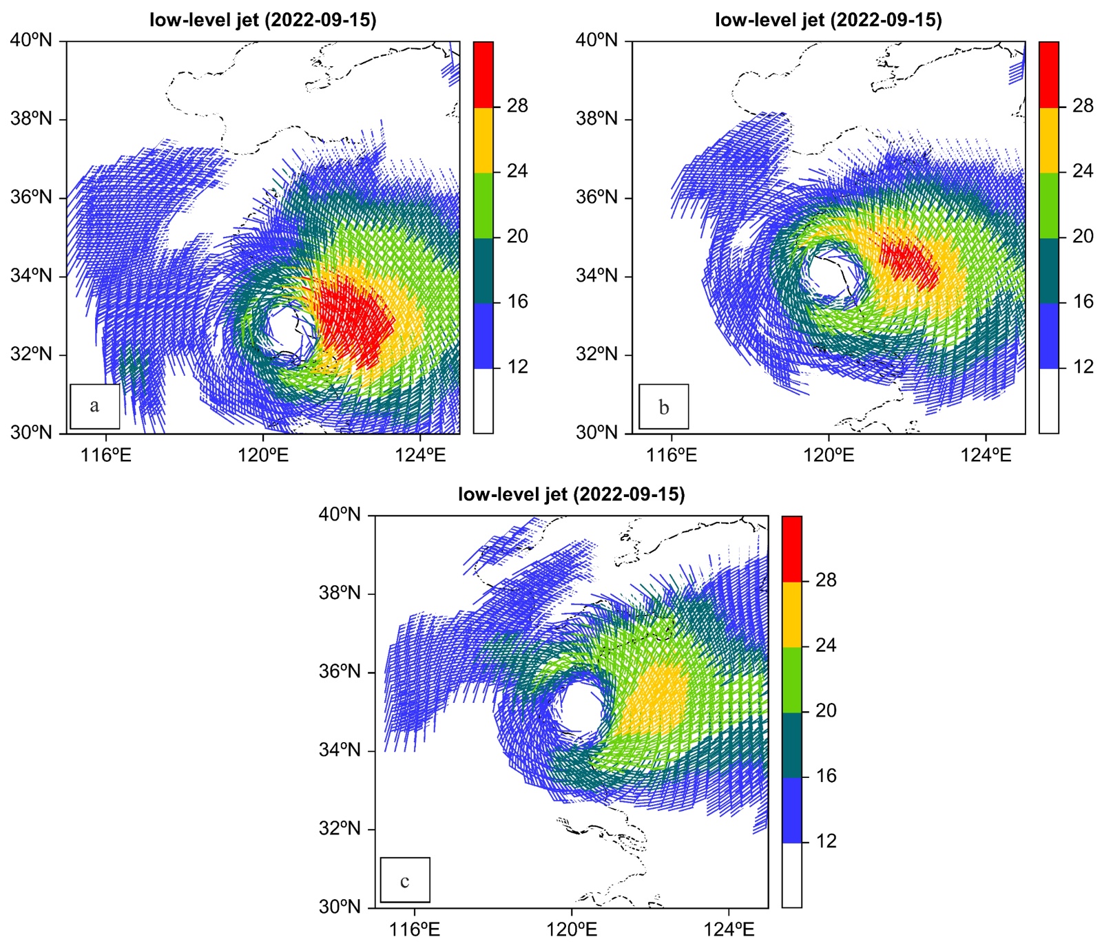 Figure 6. Low-level jet at 850 hPa at 08:00 CST 15 (a), 14:00 CST 15 (b), and 20:00 CST 15 (c) September 2022