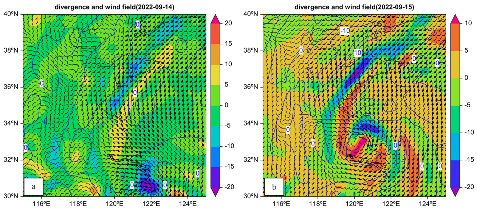 图7. 2022年9月14日20时(a)、15日08时(b)、15日14时(c)、15日20时(d) 500 hPa风场(风向杆,单位:m/s)、散度场(蓝色实线,单位:10−5/s)和850hPa散度场(色阶,单位:10−5/s)