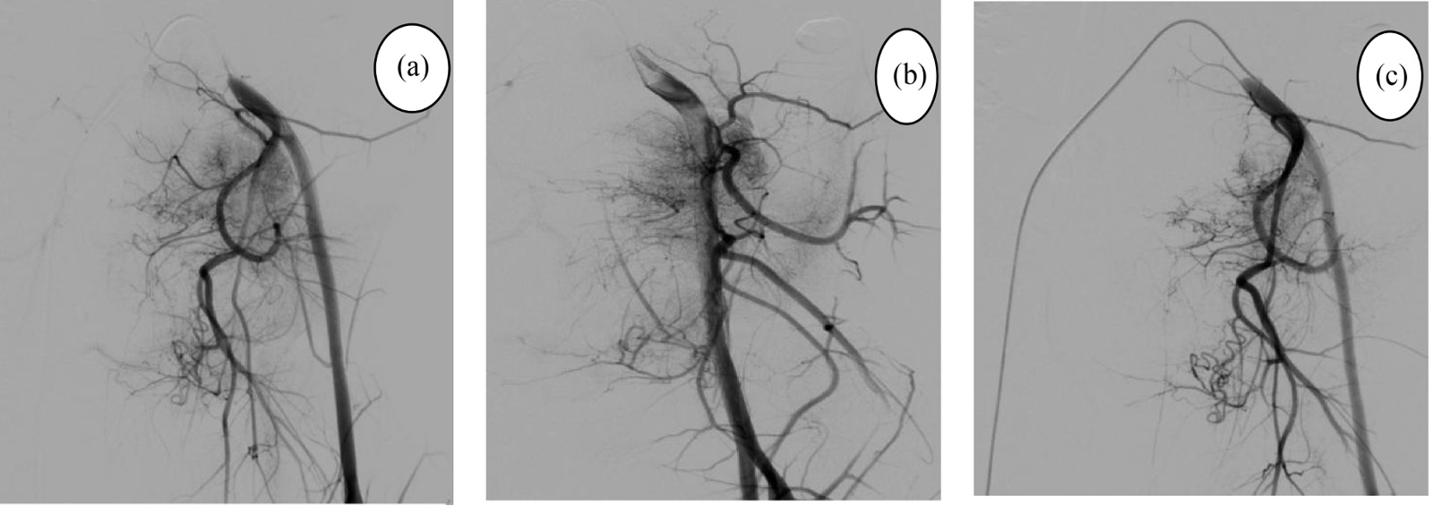 (a),(b):栓塞前左侧髂内动脉造影见肿瘤染色丰富;(c):明胶海绵颗粒栓塞后造影见肿瘤染色减少。