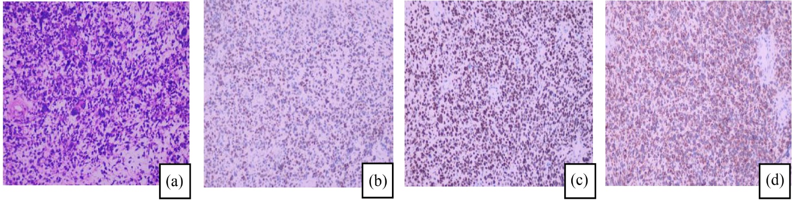 尿管支架置入术”,术中见左侧腹膜后巨大质硬肿瘤,分离结扎髂内血管分支后完成肿瘤大部切除,术中出血约1500 mL。术后病理:肿瘤切面呈“鱼肉样”,伴坏死及出血。镜下见肿瘤细胞弥漫性片状分布,呈梭形、圆形或卵圆形,异型性明显,核分裂象易见(图3(a))。免疫组化:Desmin (3+)、MyoD1 (3+)、myogenin (局灶1+) (图3(b)~(d))。病理诊断:(腹膜后)胚胎型横纹肌肉瘤(eRMS)。术后患者已转至上级医院接受系统放化疗。