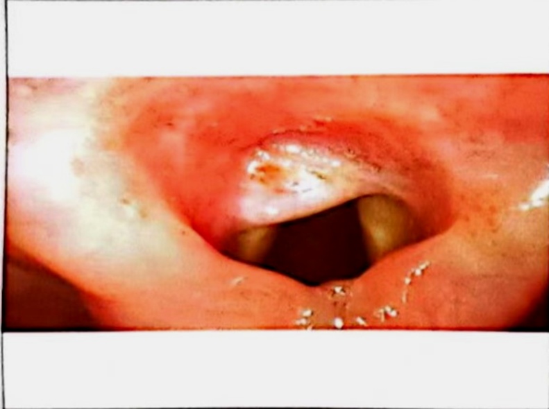 Figure 1. Electronic laryngoscopy shows: A pink neoplasm is visible in the anterior middle part of the bilateral ventricular bands on the laryngeal surface of the epiglottis