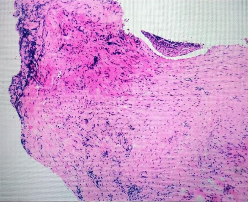 入院后完善血常规、血生化、凝血四项、术前九项、尿便常规、心电图、胸片等检查,电子喉镜下检查(见图1)会厌喉面双侧室带前中部可见一粉红色新生物。排除手术禁忌症后,2024年10月11日全麻前联合镜下喉功能重建术 + 喉噗黏连松解术,手术经过:1. 患者取仰卧位,气管插管静脉麻醉后常规消毒、铺巾;2. 经口导入前联合镜,见室带前中处与会厌喉面有1 × 1.5 cm大小粉红色新生物,局部白色瘢痕样组织增生,与周围组织分界清楚,表面平整,未见破溃、糜烂、出血及异常分泌物,术中切除新生物松解粘连室带,喉剪修剪新生物边缘,电凝新生物基底止血,检查无组织残留,取新生物病损送病检;4. 术毕,安返,术中出血约5 ml。术后激素抗炎、消肿,止血,雾化吸入对症治疗。术后病理检查(图2)示:(喉部病损)送检组织衬覆少许鳞状上皮,固有层充血、出血及水肿,伴梭形细胞及胶原纤维增生,淋巴细胞、浆细胞和少许中性粒细胞浸润,考虑瘤样纤维组织增生。免疫组化结果回报:SOX-10 (−),β-catenin (−),SMA (+),Ki67 (个别细胞+),MSA (−),Desmin (−),CD34 (血管+),MyoD1 (−),myogenin (−),STAT6 (−),Vimentin (+),ALK (−)。特殊染色结果:弹力纤维(−)。术后予以消肿、禁声、止血等对症治疗,术后我们进行了随访,在随访复查中,患者恢复良好,术后复查电子喉镜(图3)示:喉蹼术后改变,声带活动好,闭合可。患者声嘶改善,呼吸较术前顺畅,无咽痛、咽痒、吞咽困难、咳痰、痰中带血等不适,康复出院。