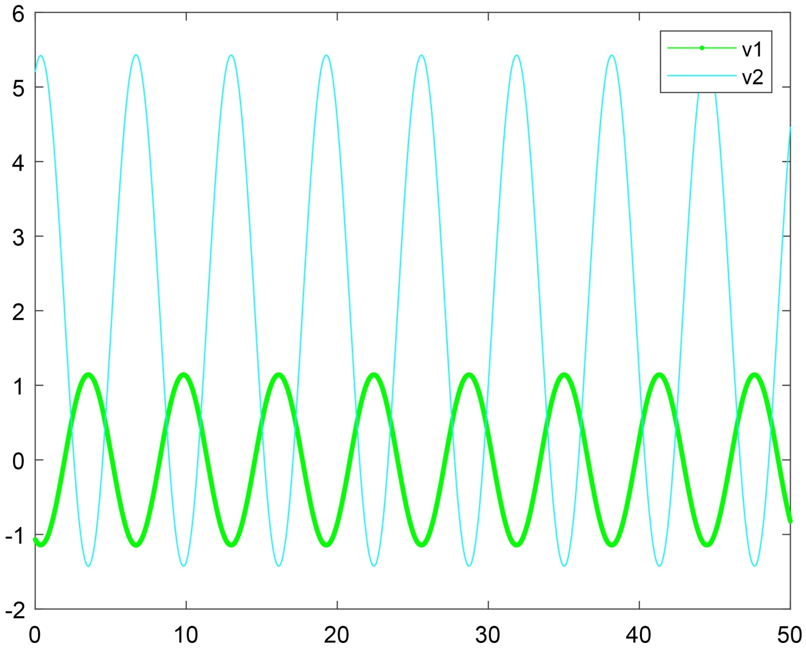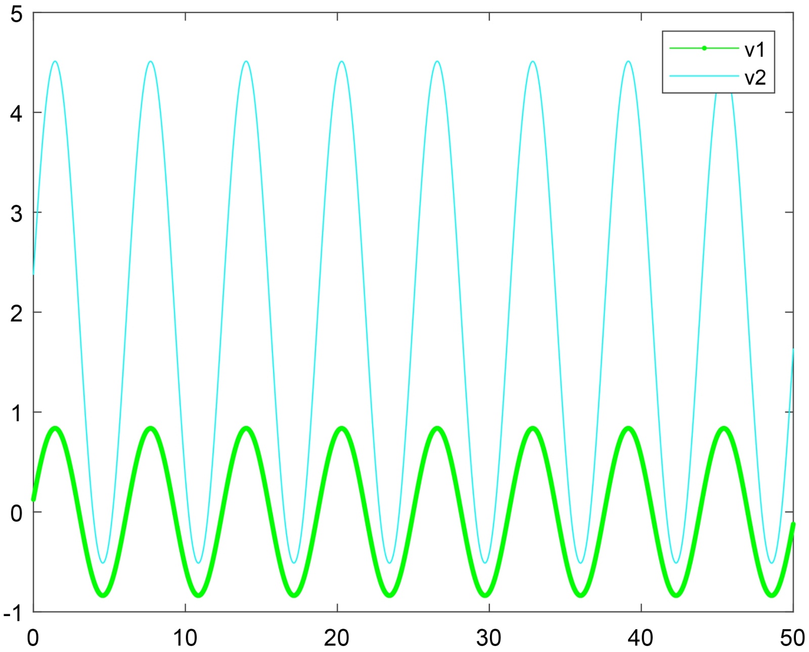 Figure 3. Generalized synchronization solution of system (1), v1 denotes oscillator 1, v2 denotes oscillator 2. (a) System (1) exhibits synchronization type 1 with parameters n = 0.7, c = −0.3, w = 1; (b) System (1) exhibits synchronization type 2 with parameters n = 0.7, c = 0.2, w = 1