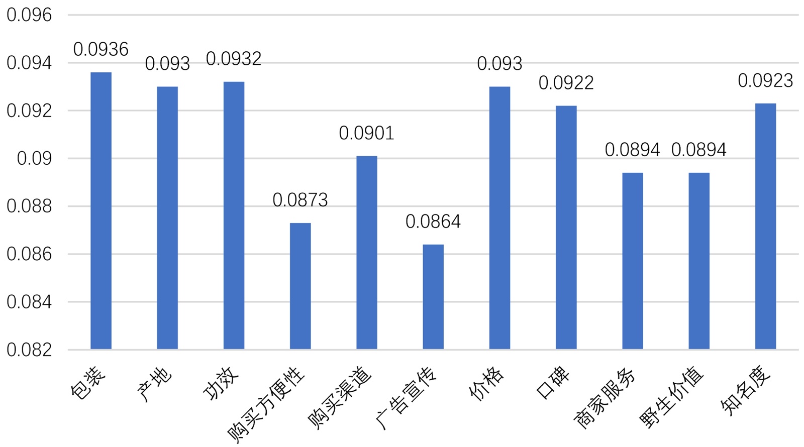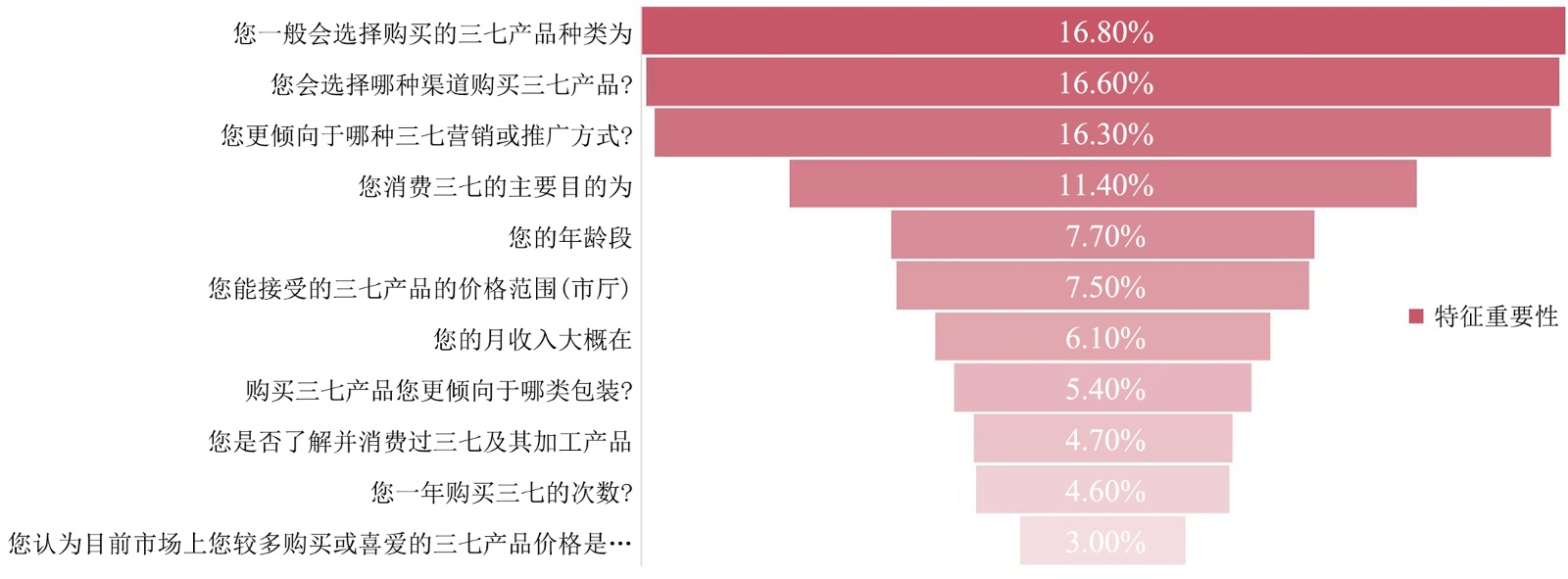 本研究通过整合Lasso-Logistic回归与AHP (层次分析法)的综合分析,揭示了三七产品的消费决策模式。Lasso回归方法首先识别出影响购买行为的六个关键变量:年龄、职业、月收入、价格承受区间、年消费量及产品认知度。分析结果勾勒出核心消费群体特征:主要为31~40岁的政府及企业职员,月收入在3001~6000元之间,且已具备三七产品的基本认知。本次调查覆盖所有年龄组,其中18~30岁和31~40岁占比最高,分别为32.03%和26.50%。个体经营者和私营企业员工占比最高,均在20%左右,而退休人员、退休人员和失业人员的比例相对较低。因此,大多数消费者有一定的购买力。本次调查中,月收入在3001~6000元的消费者占比最高,其次是月收入低于3000元、6001~10,000元以及超过10,000元的群体(表1)。